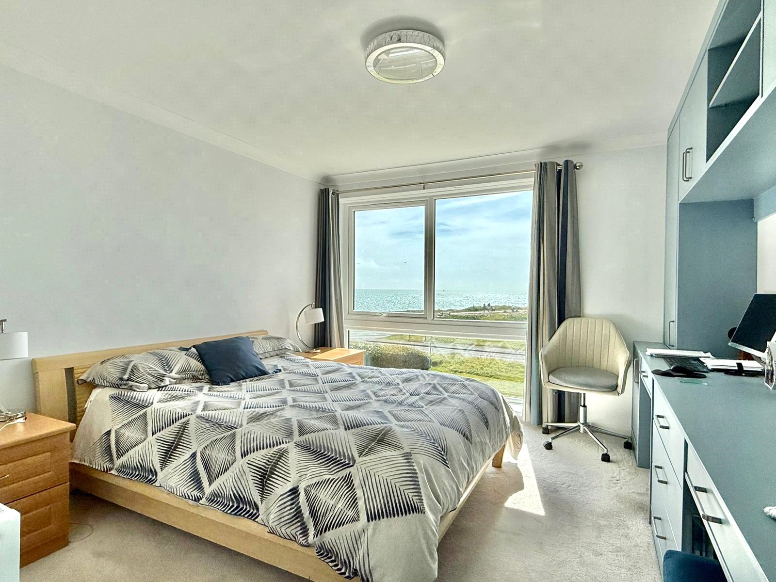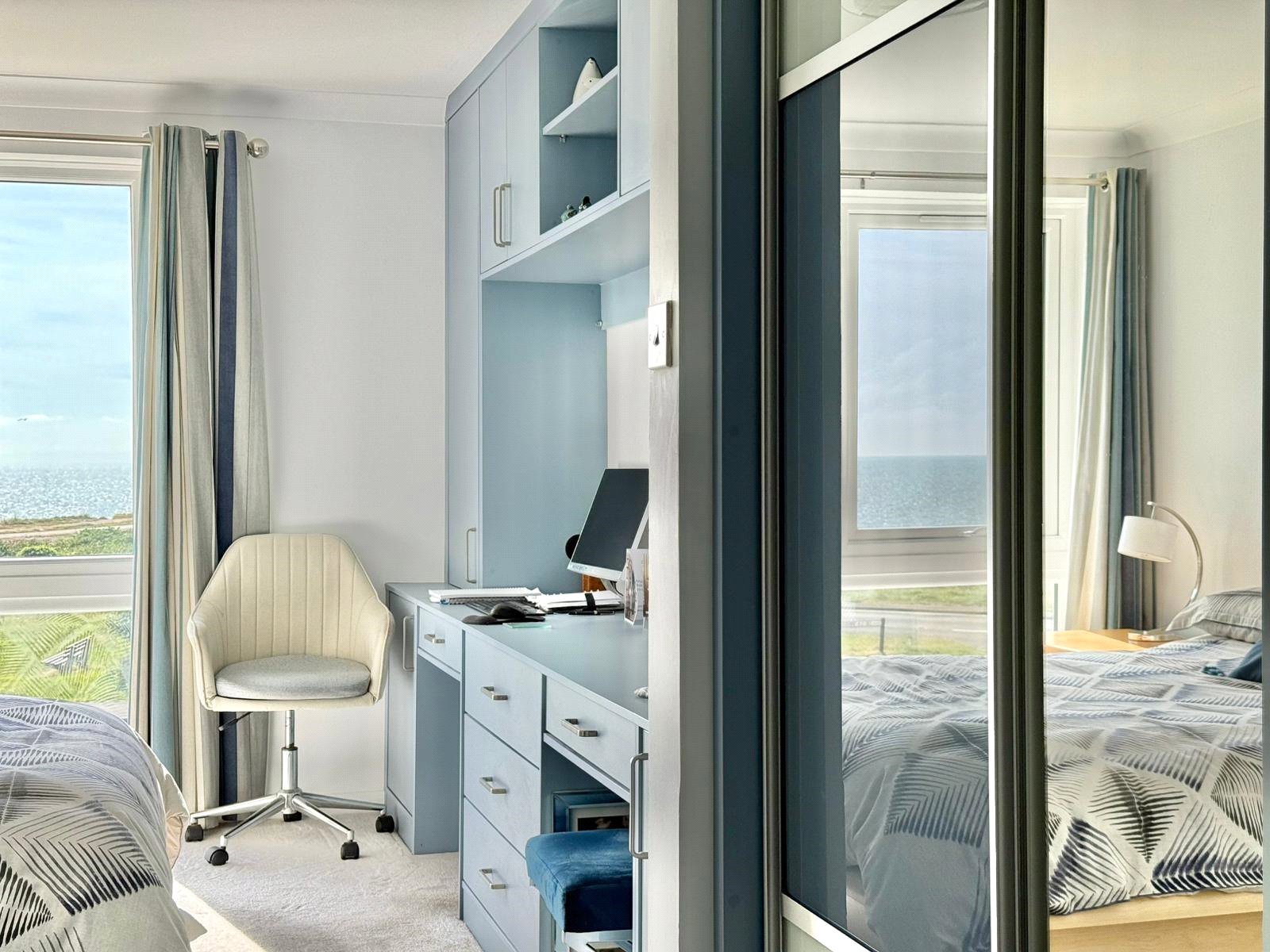 Superbly appointed bedroom with a full height UPVC double glazed window to the Needles, clifftop and Christchurch Bay aspect, triple sliding door built in wardrobe and further extensive range of fitted furniture incorporating two dressing table knee hole recesses with adjacent base level drawers and cupboards, further overhead storage cupboards, central heating radiator, ceiling light point, door to: