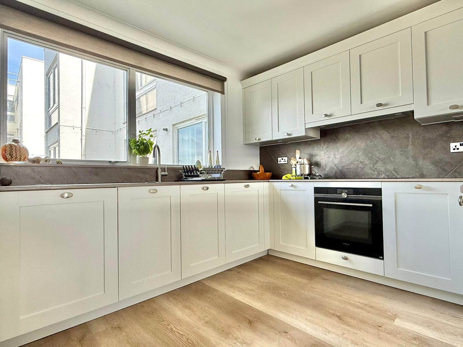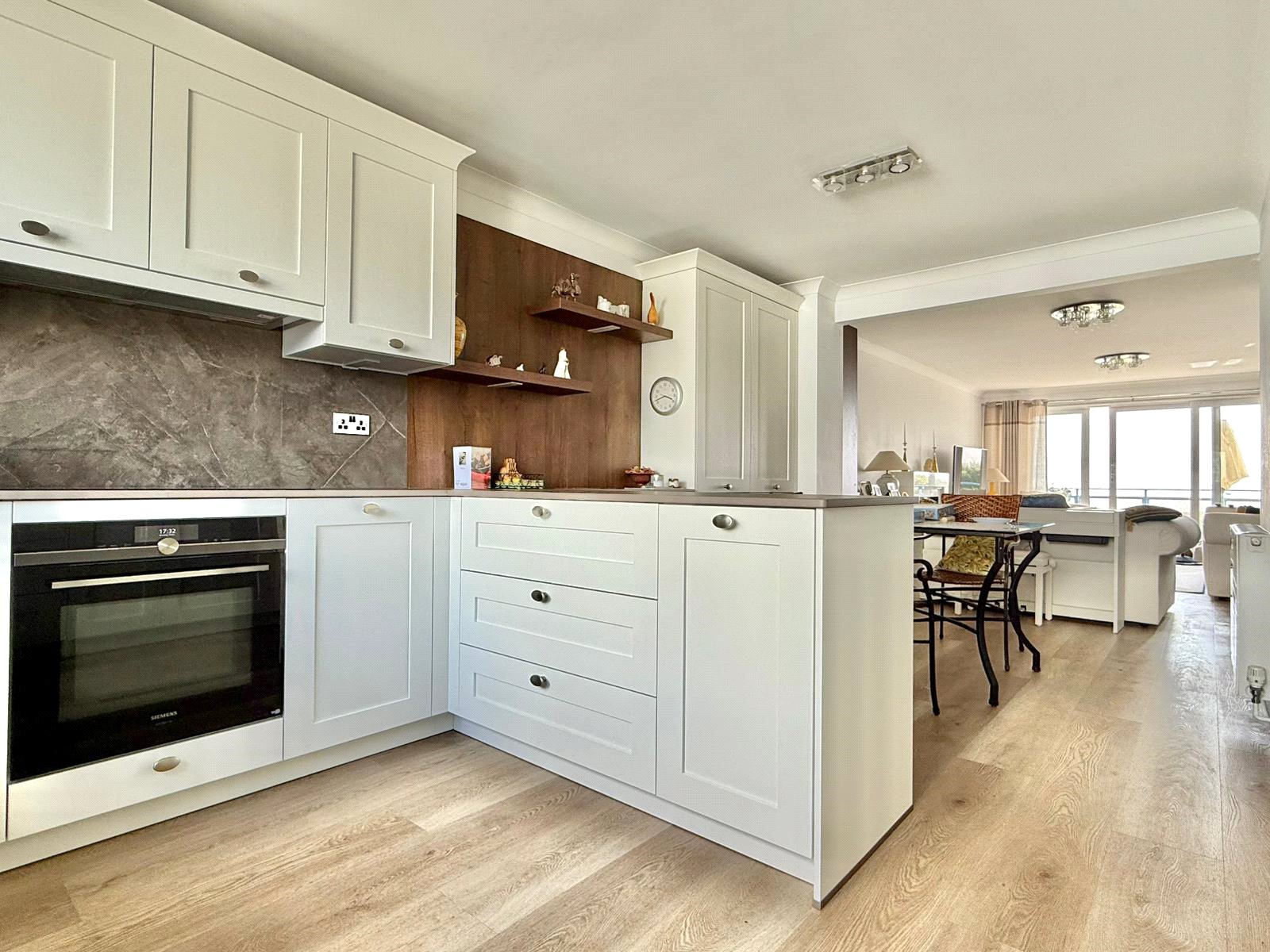 Kitchen comprising one and a half bowl mixer tap sink unit set into Dekton worksurface with base cupboard and drawer units and matching eye level cupboard units integrated Siemens oven and induction hob with extractor over, integrated Siemens dishwasher, fridge freezer and washing machine, worksurface lighting, oak effect flooring, central heating radiator, space for good sized dining table and chairs, view through the sitting room to the clifftop and seafront aspect, further double glazed window to the rear aspect, deep cupboard housing the wall mounted Valient central heating boiler. From the entrance hall door leads to: