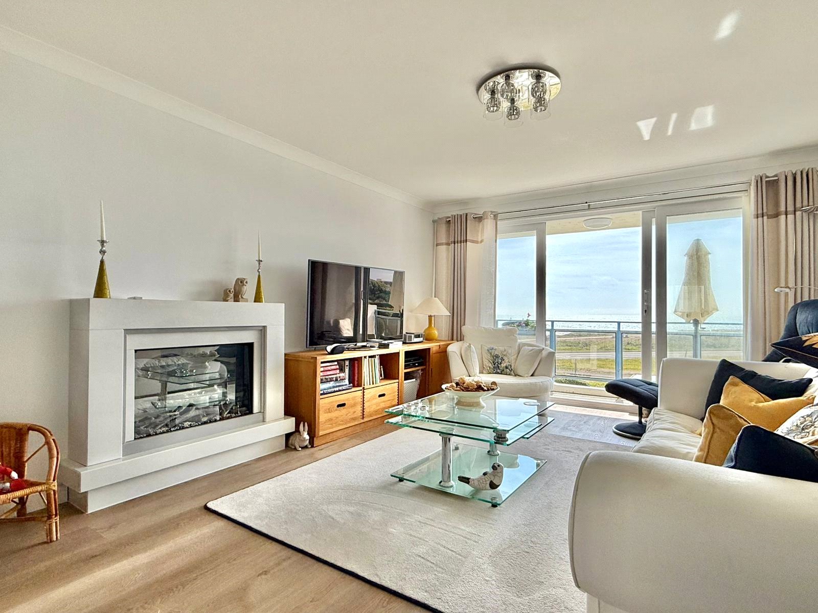 A superb ambient living space with UPVC double glazed sliding patio doors overlooking and leading onto the covered westerly aspect sun balcony with an expansive outlook towards the cliff top, Christchurch Bay and the Purbecks, continuation of the oak effect flooring, central feature fireplace, central heating radiator, ceiling light point, tv point.