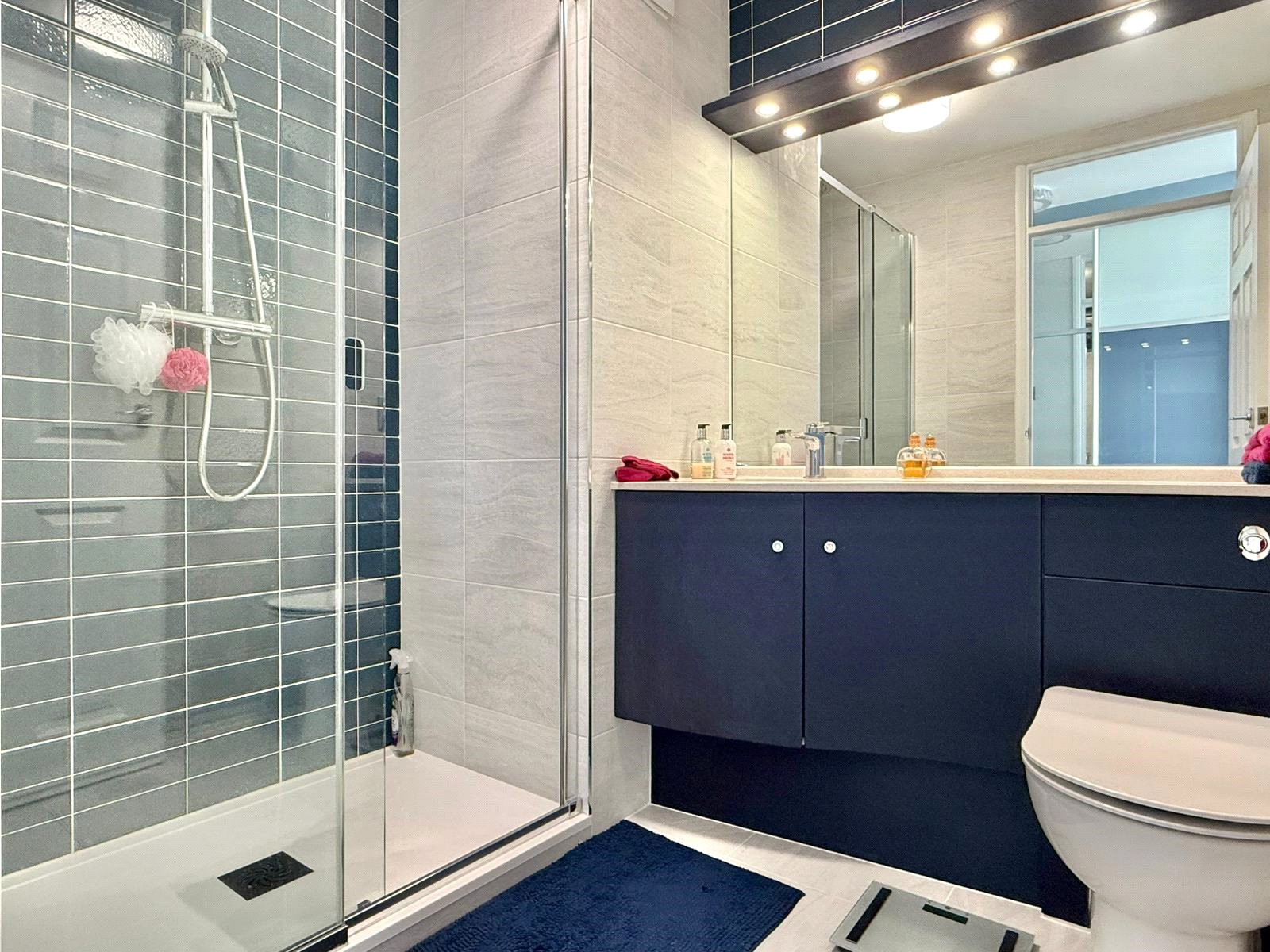 Comprising good sized shower, concealed cistern wc with adjacent vanity wash hand basin with lighting over, shaver point, tiled floor and walls, heated towel rail, extractor, ceiling light point.