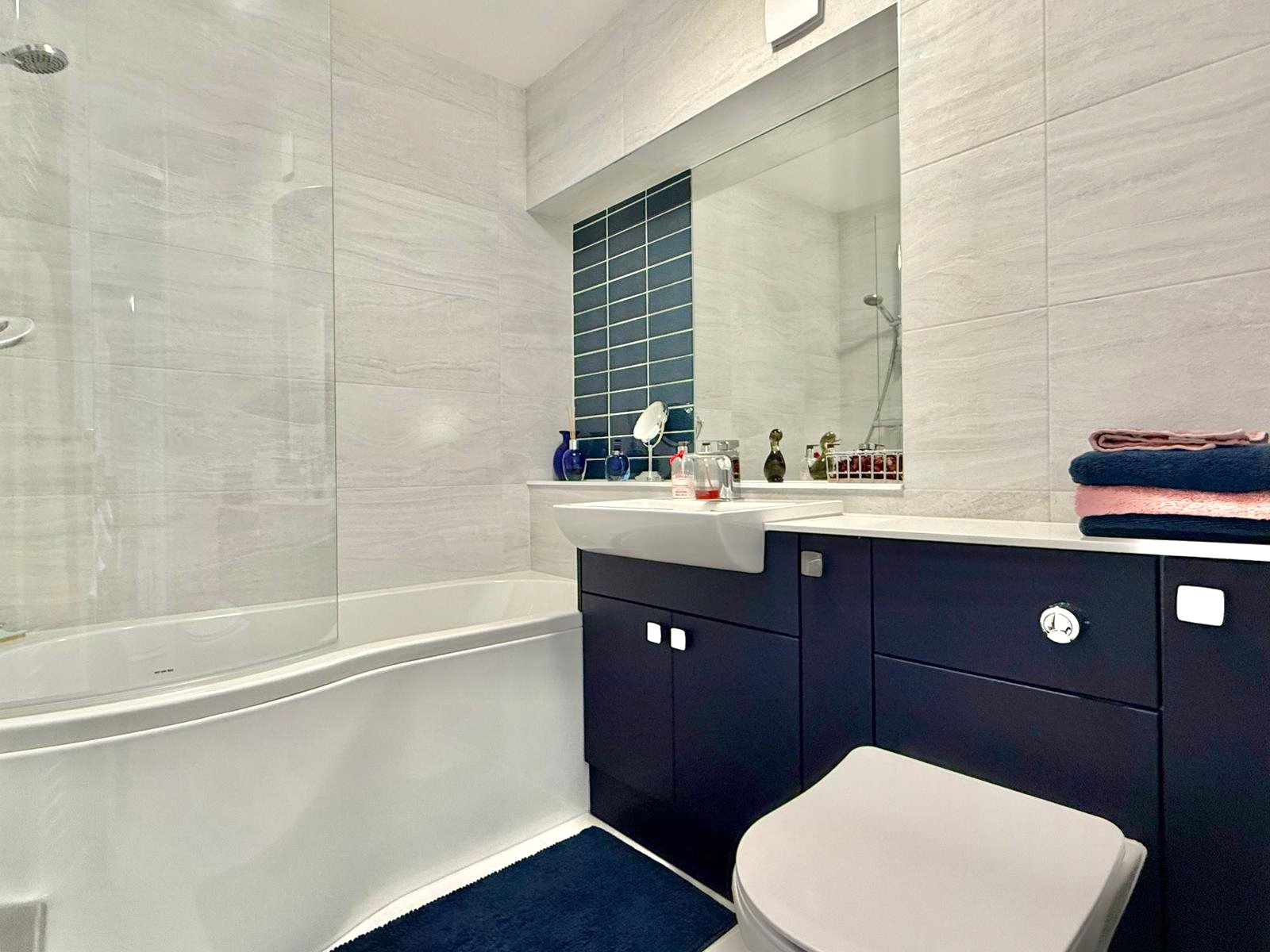 Incorporating bath with fitted shower and shower screen, concealed cistern wc with adjacent vanity wash hand basin, extractor, heated towel rail, tiled floor and walls, ceiling light point
