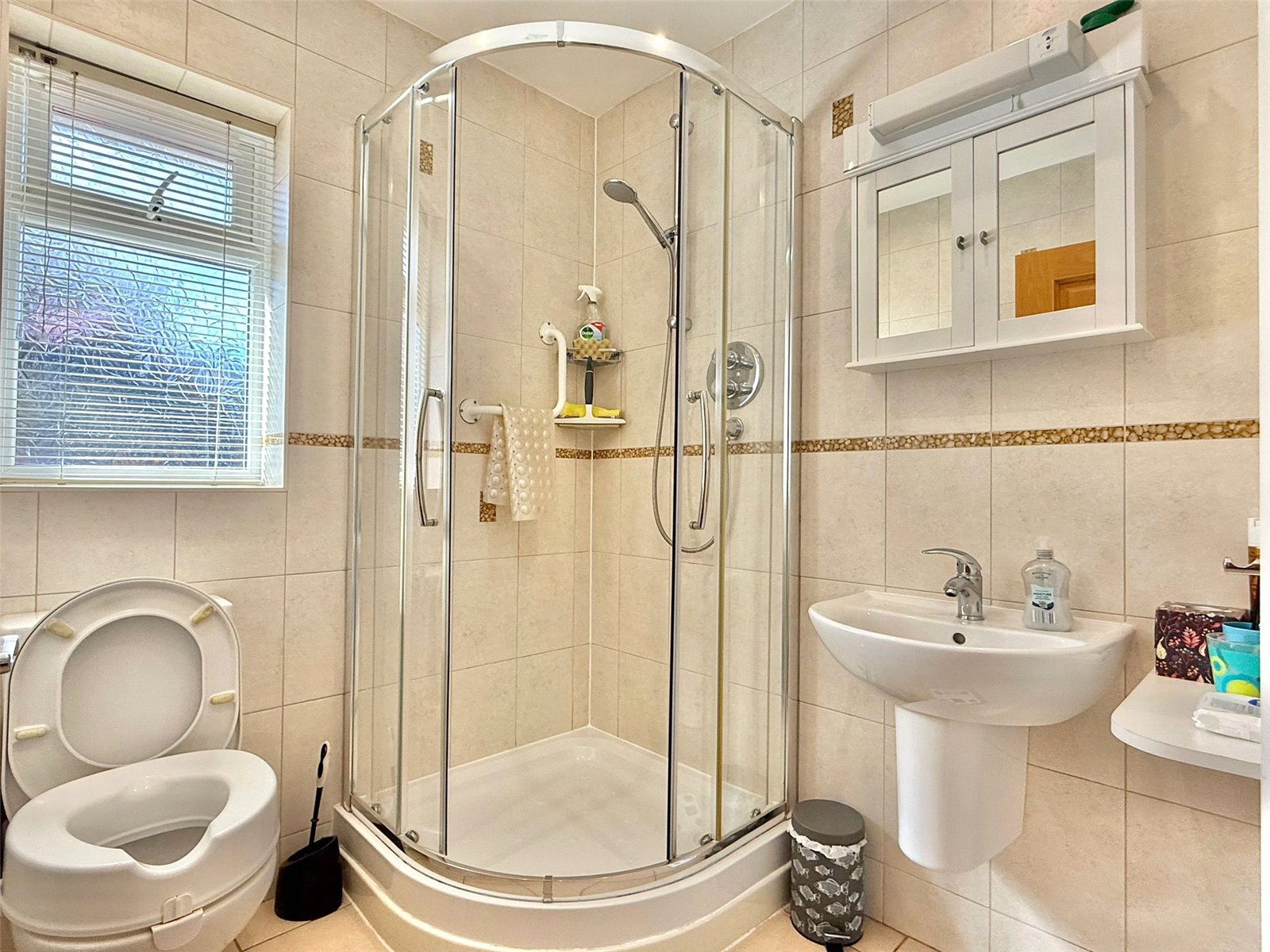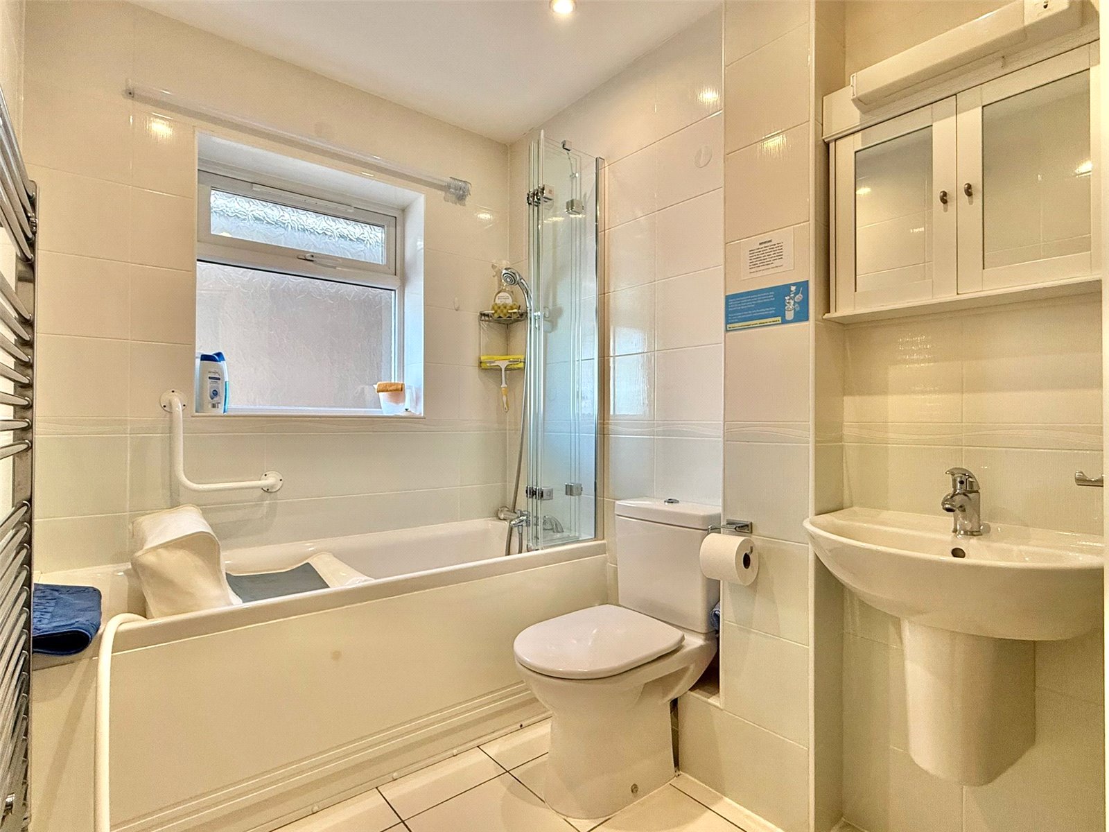 Comprising bath with mixer tap shower attachment and shower screen, wc, wash hand basin, shaver light point, recess ceiling spotlighting, tiled floor and walls, heated towel rail, obscured UPVC double glazed window, extractor fan