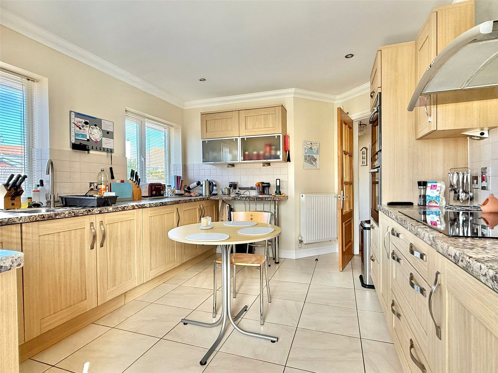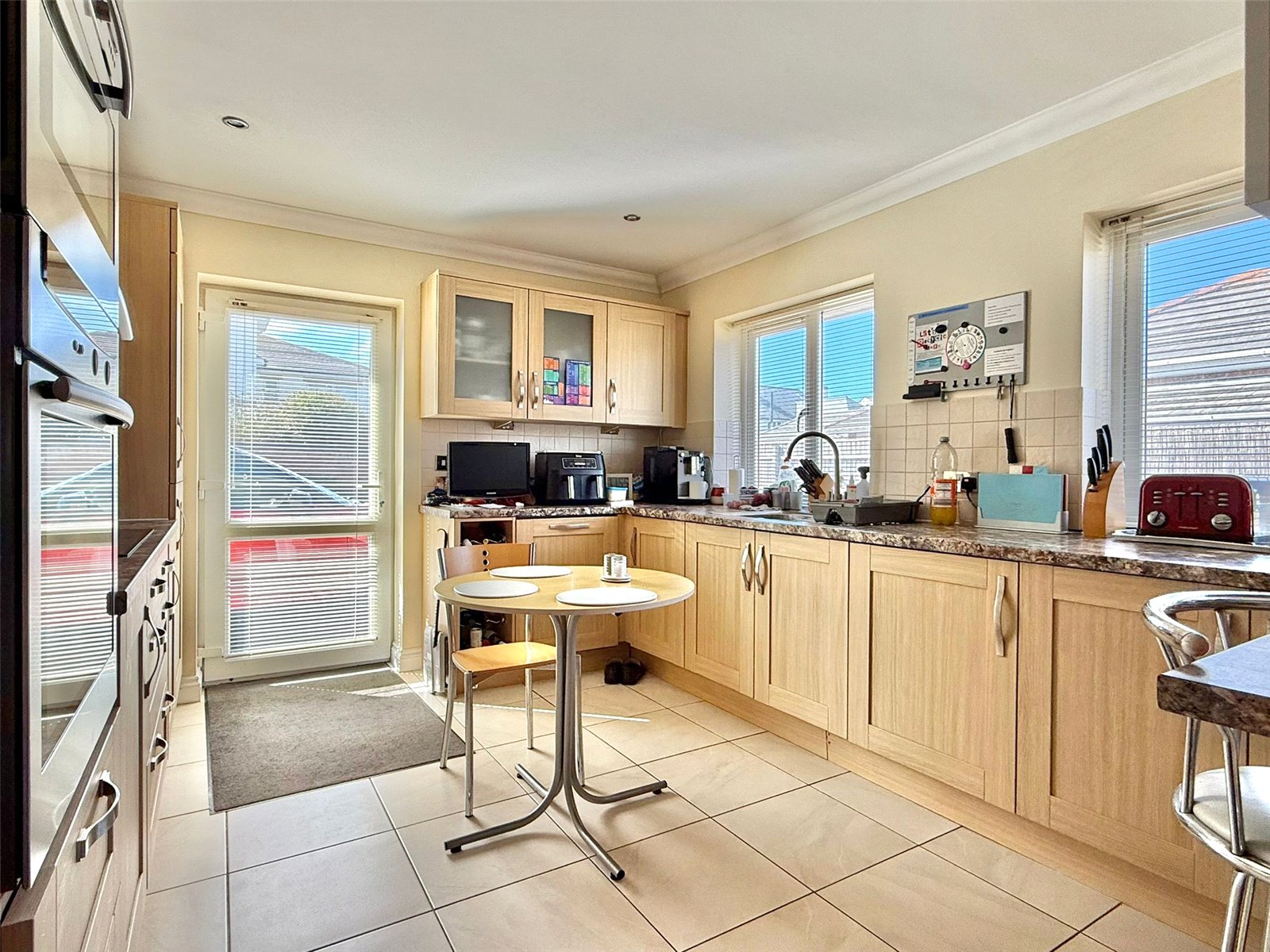 Comprising single bowl single drainer mixer tap sink unit set in a worksurface with base cupboard and drawer units and matching eye level cupboard units, integrated double combination oven, electric hob with extractor over, integrated fridge freezer, dishwasher, washing machine, tiled flooring, work surface lighting, recess ceiling spotlighting, UPVC double glazed windows and side aspect door, central heating radiator
