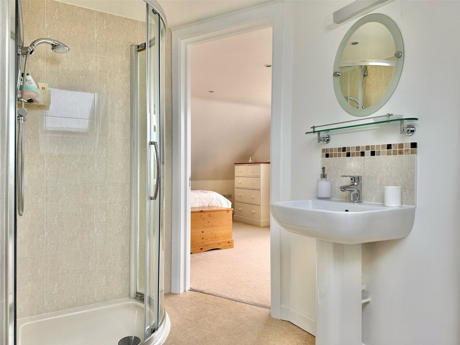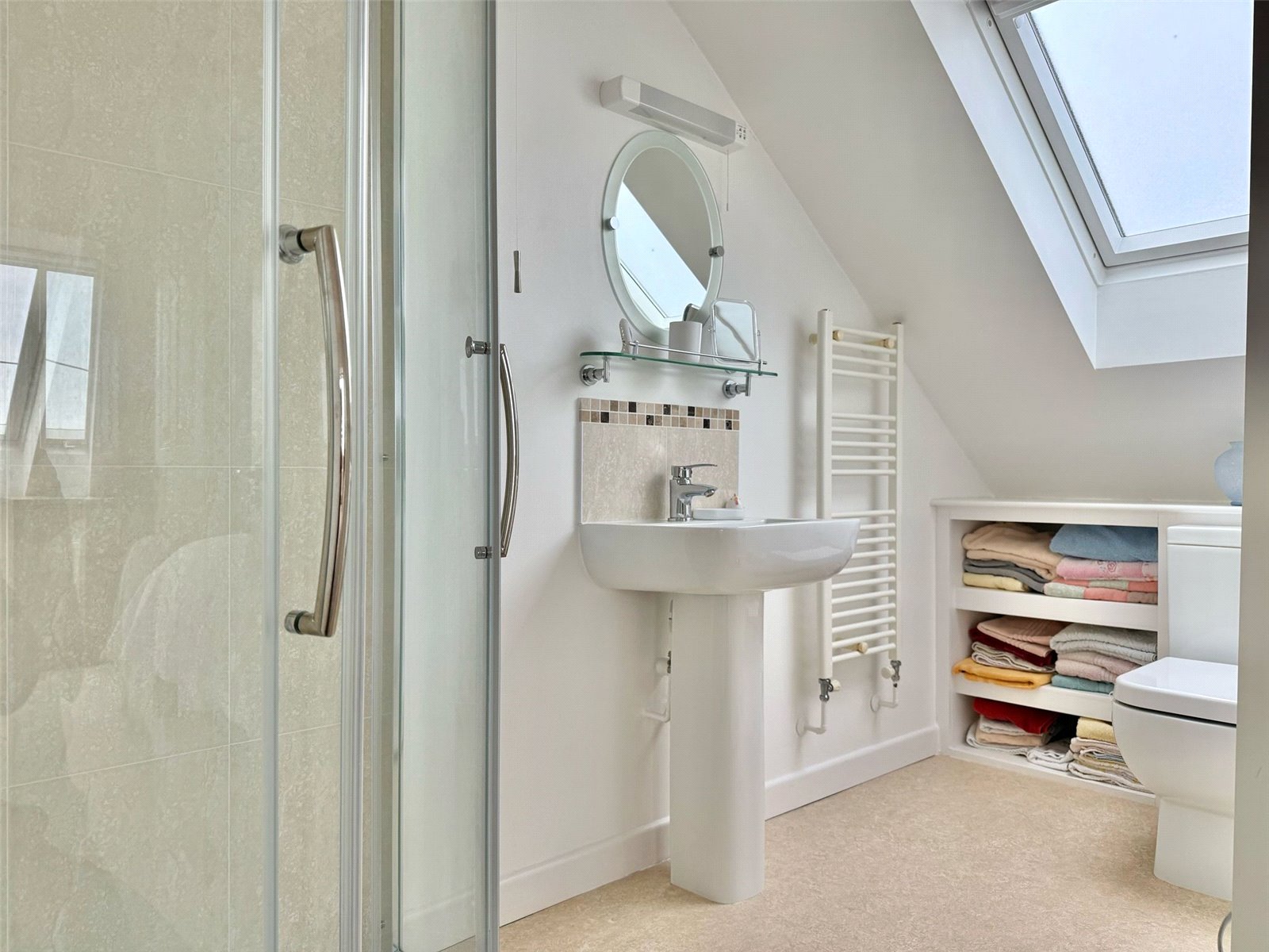 Comprising shower, wc, wash hand basin with shaver light point over, heated towel rail, recessed ceiling spotlighting, extractor, obscure double glazed velux window, toiletry shelving