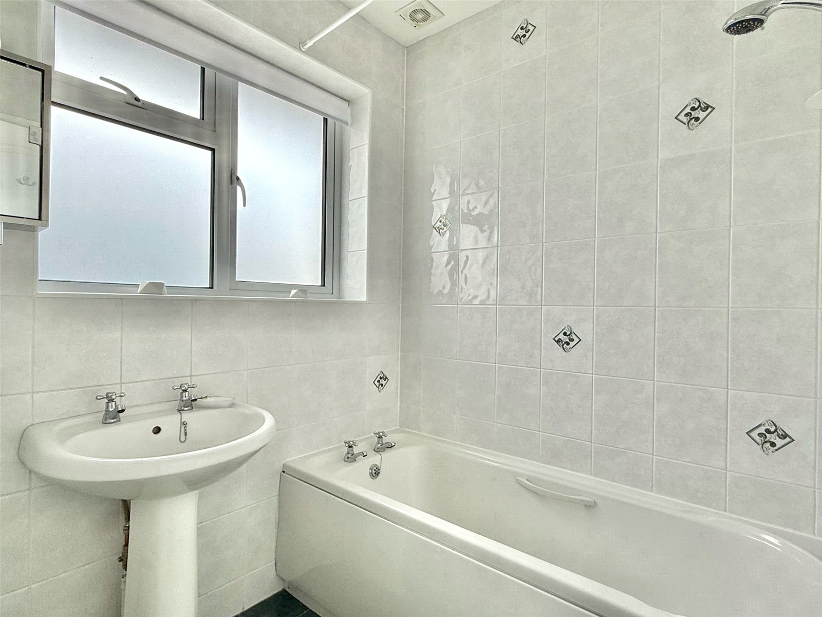 Comprising bath with fitted shower, wash hand basin, tiled floor and walls, central heating radiator, obscure UPVC double glazed window, recessed ceiling spotlighting, and extractor fan
