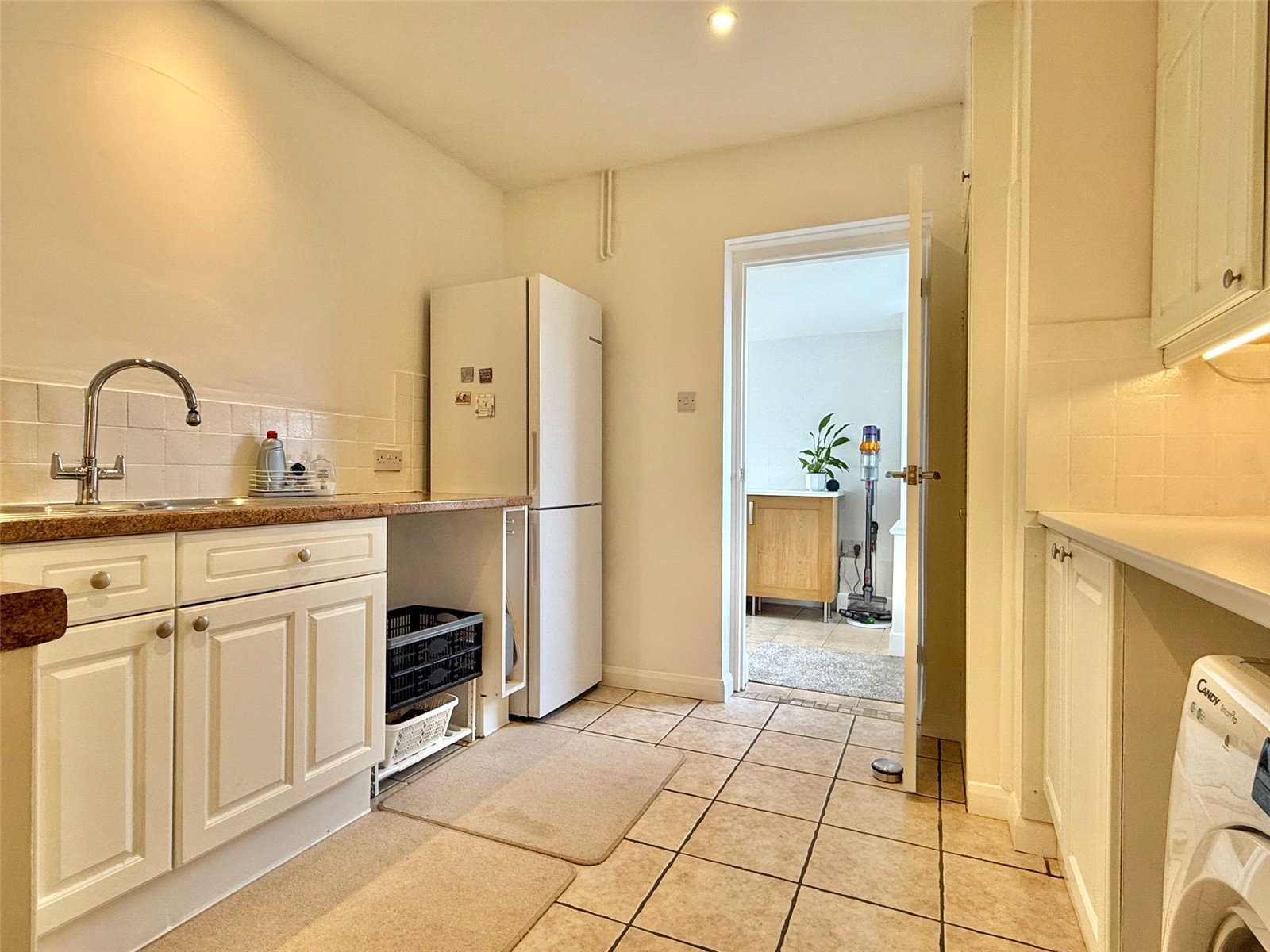 Comprising one and a half bowl single drainer mixer tap stainless steel sink unit set in a work surface with base cupboard and drawer units and matching eye level cupboard units, space and plumbing for washing machine and tumble dryer, ceramic tiled flooring, part tiled walls, recessed ceiling spotlighting, space for tall fridge/ freezer, and further door to: