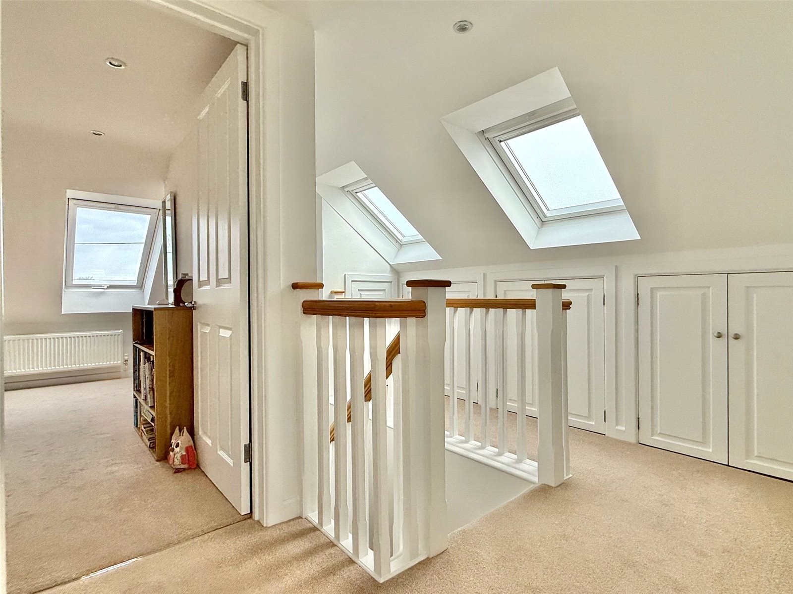 From the Reception Hall stairwell leads to the first floor landing with central heating radiator, obscure double glazed velux windows, three eaves storage cupboards, further cupboard housing the Worcester gas fired central heating boiler, recessed ceiling spotlighting, and doors leading to: