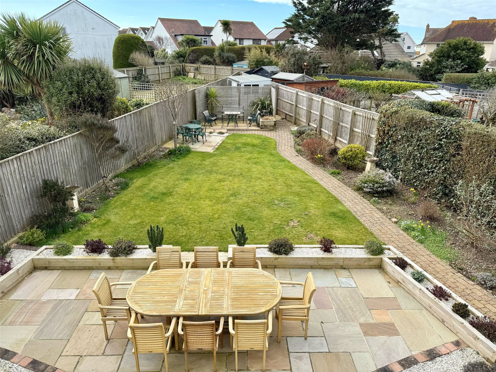 The south facing rear garden has a large paved terrace immediately adjacent to the property with raised sleeper bed borders and the remainder laid to shaped lawn, a further paved terrace area, a brick paved footpath leads to the rear of the garden where there is a further paved terrace and attractive fenced screening beyond which is a large Timber Garden Store, shrub/ flower bed borders and fenced boundaries