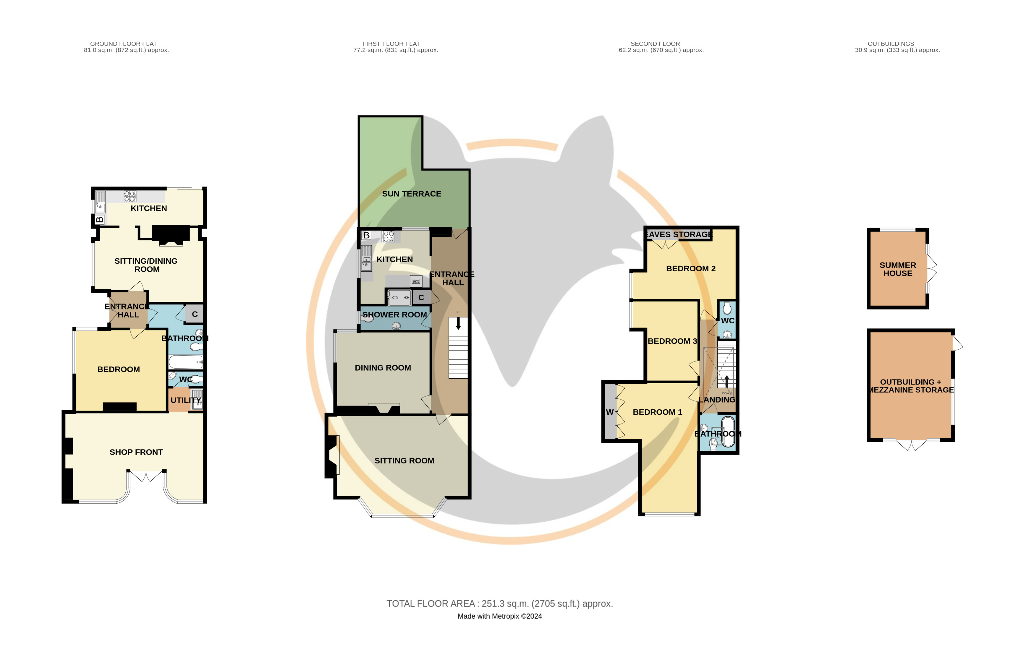 There is a brick paved courtyard style garden with shrub borders, walled and fenced boundaries. Adjacent to the door from the kitchen of the ground floor apartment is a summer house, and set to the rear of the courtyard is a detached garage, furthermore there is a narrow tarmacadam driveway from the high street approach. Adjacent to the summer house is a pedestrian gate giving access to the driveway approach.