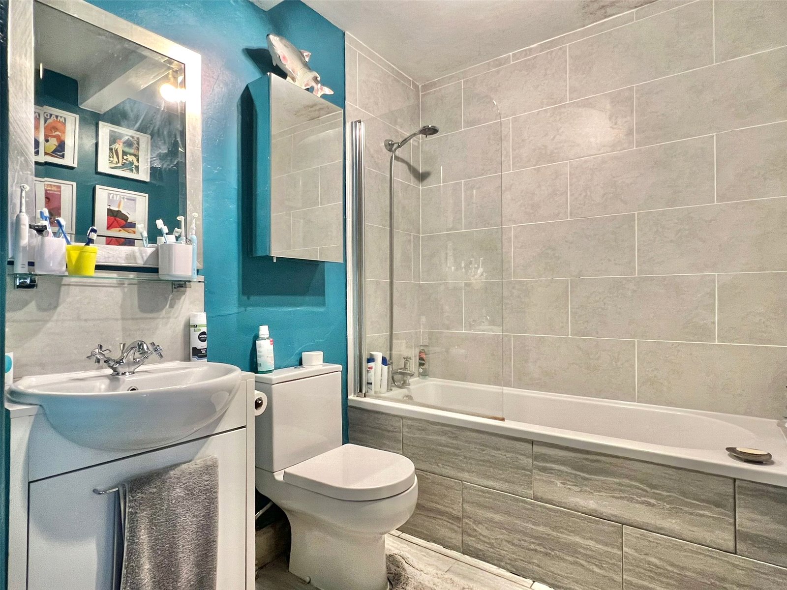 Comprising bath with mixer tap shower attachment, shower screen, wc, wash hand basin, ceiling light point, extractor, tiled flooring, part tiled walls, heated towel rail, linen cupboard
