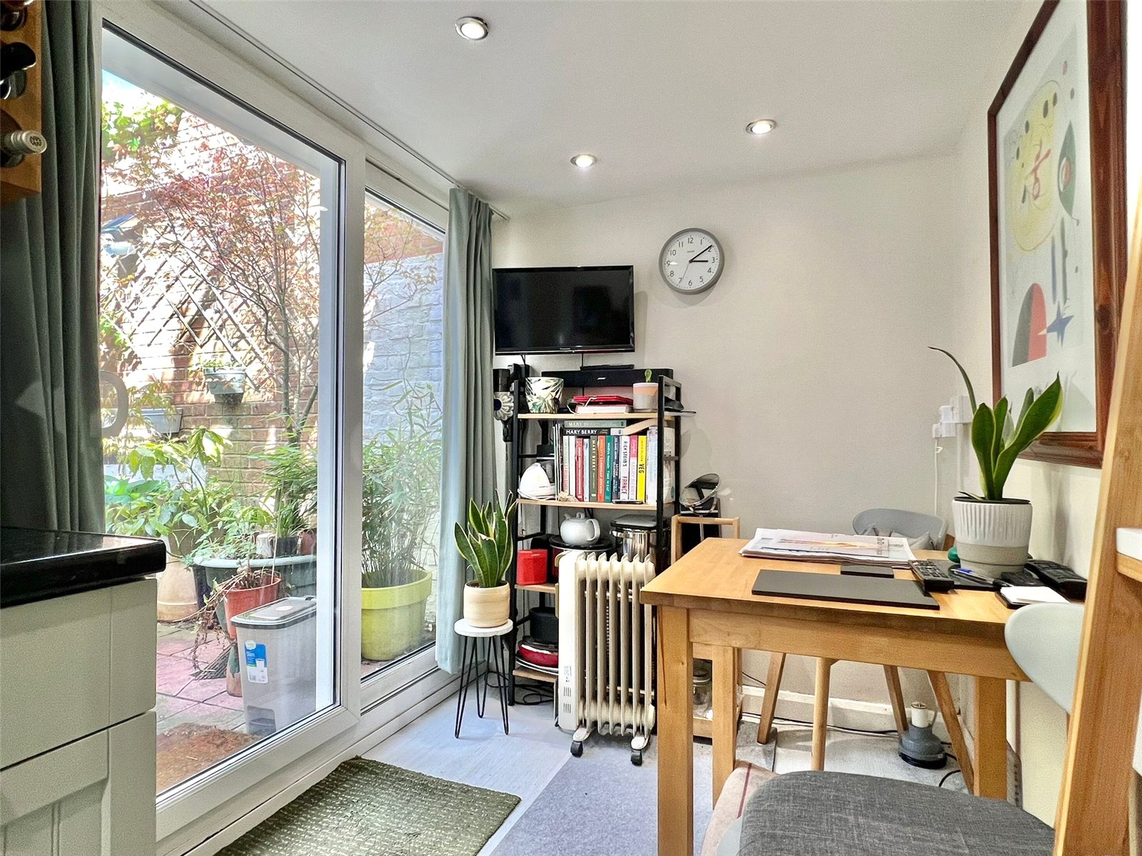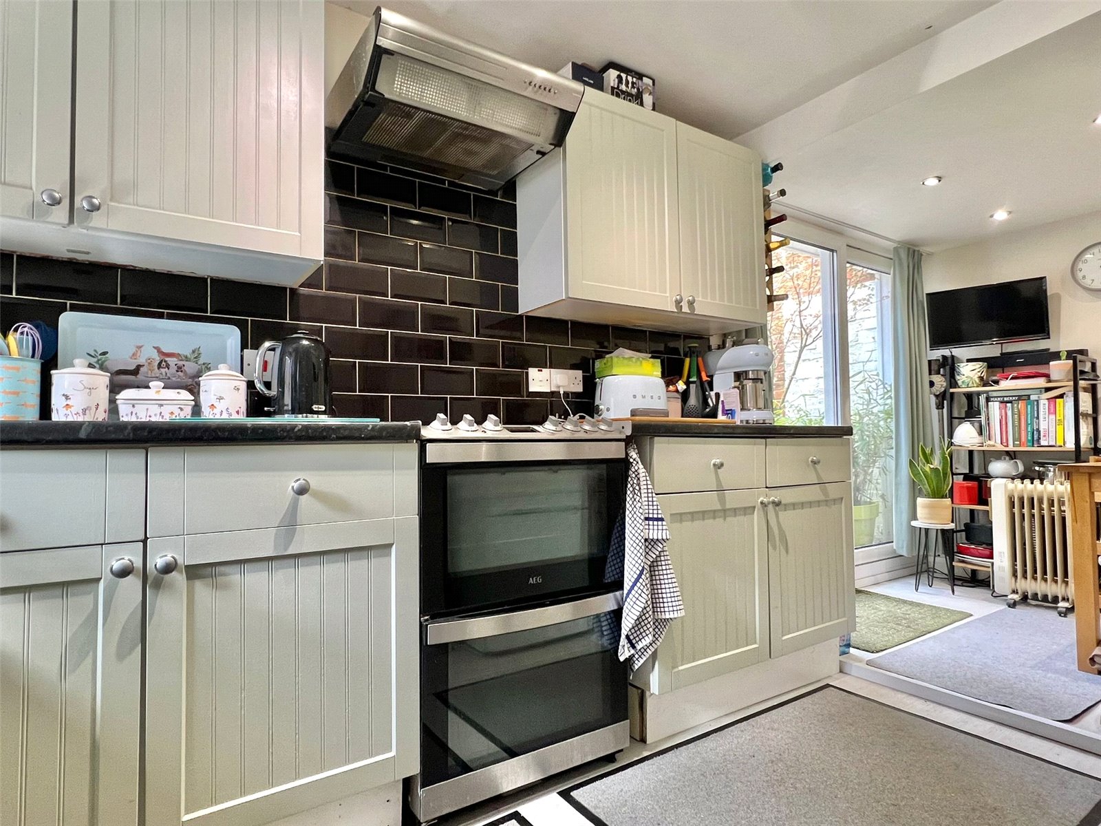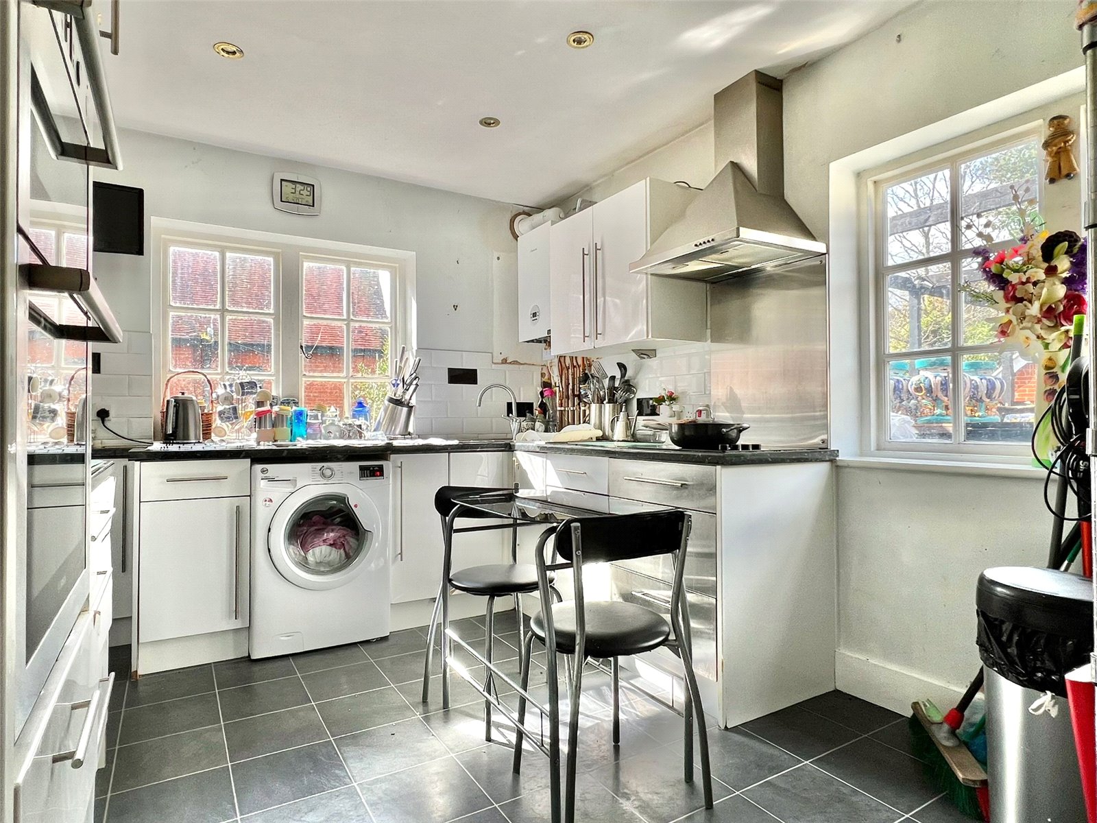 Comprising one and a half bowl single drainer mixer tap sink unit set in a worksurface with base cupboard and drawer units and matching eye level cupboard units, space for cooker with extractor over, space and plumbing for washing machine, space for fridge freezer, wall mounted gas fired central heating boiler, ceiling light point, space for breakfast table and chairs, further recess ceiling spotlighting, window and UPVC double glazed sliding patio door leading to the courtyard rear aspect