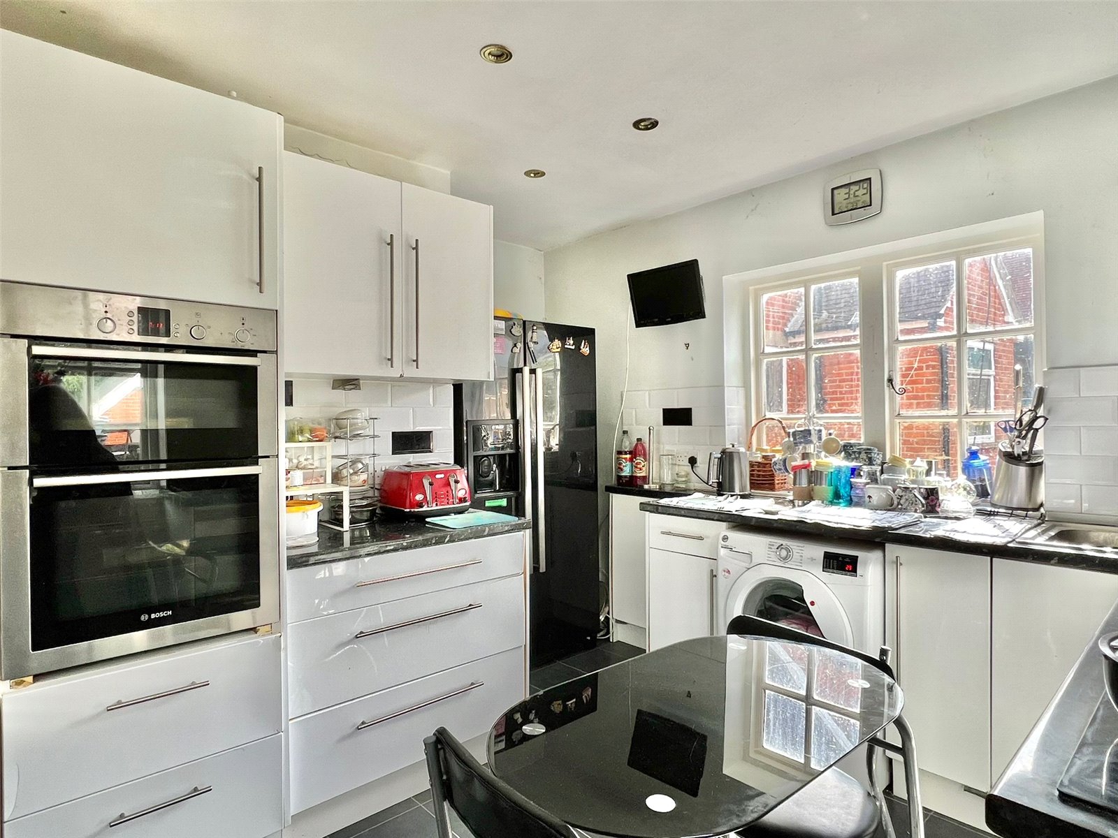 Comprising two and a half bowl mixer tap sink unit set in a worksurface, base cupboard and drawer units, matching eye level cupboard units, integrated double oven, electric hob with extractor over, space for American style fridge freezer, space and plumbing for washing machine, windows, recess ceiling spotlighting, wall mounted gas fired central heating boiler