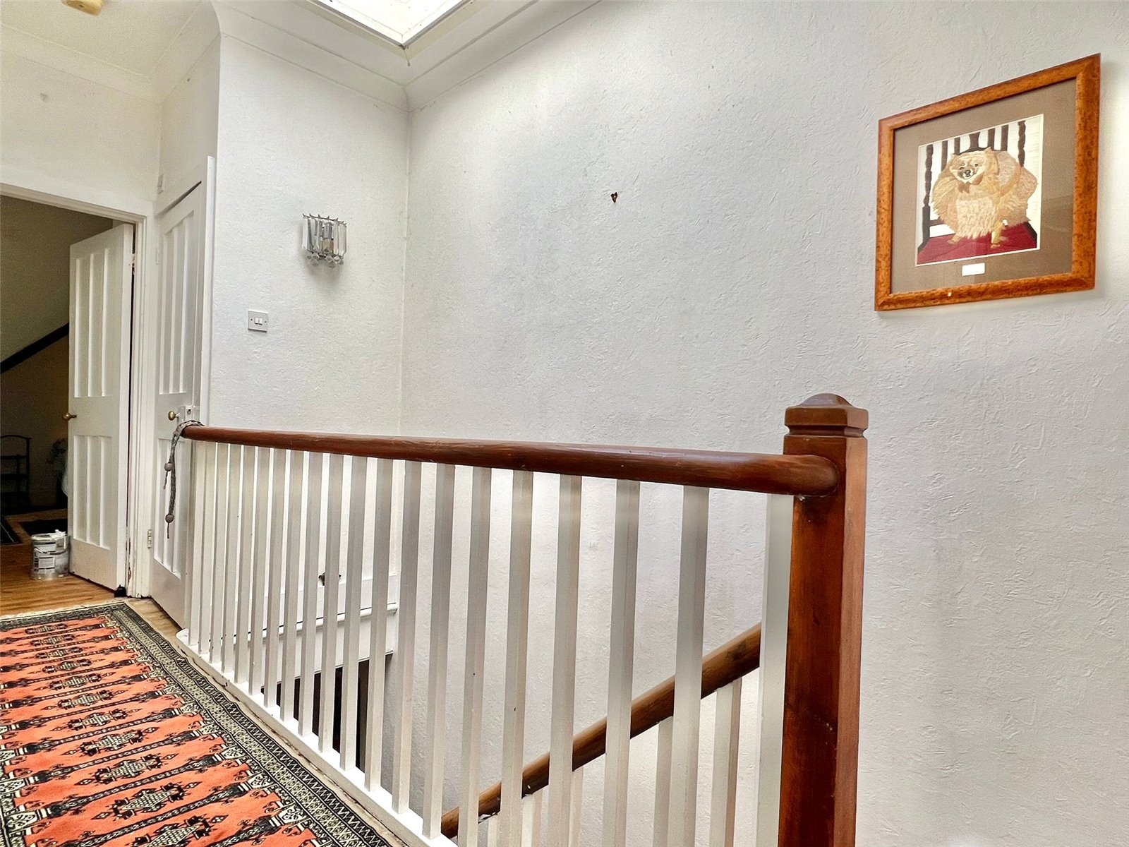 Stairwell from the Entrance Hall leads to the First Floor Landing with large lantern window, wall light point and doors leading to: