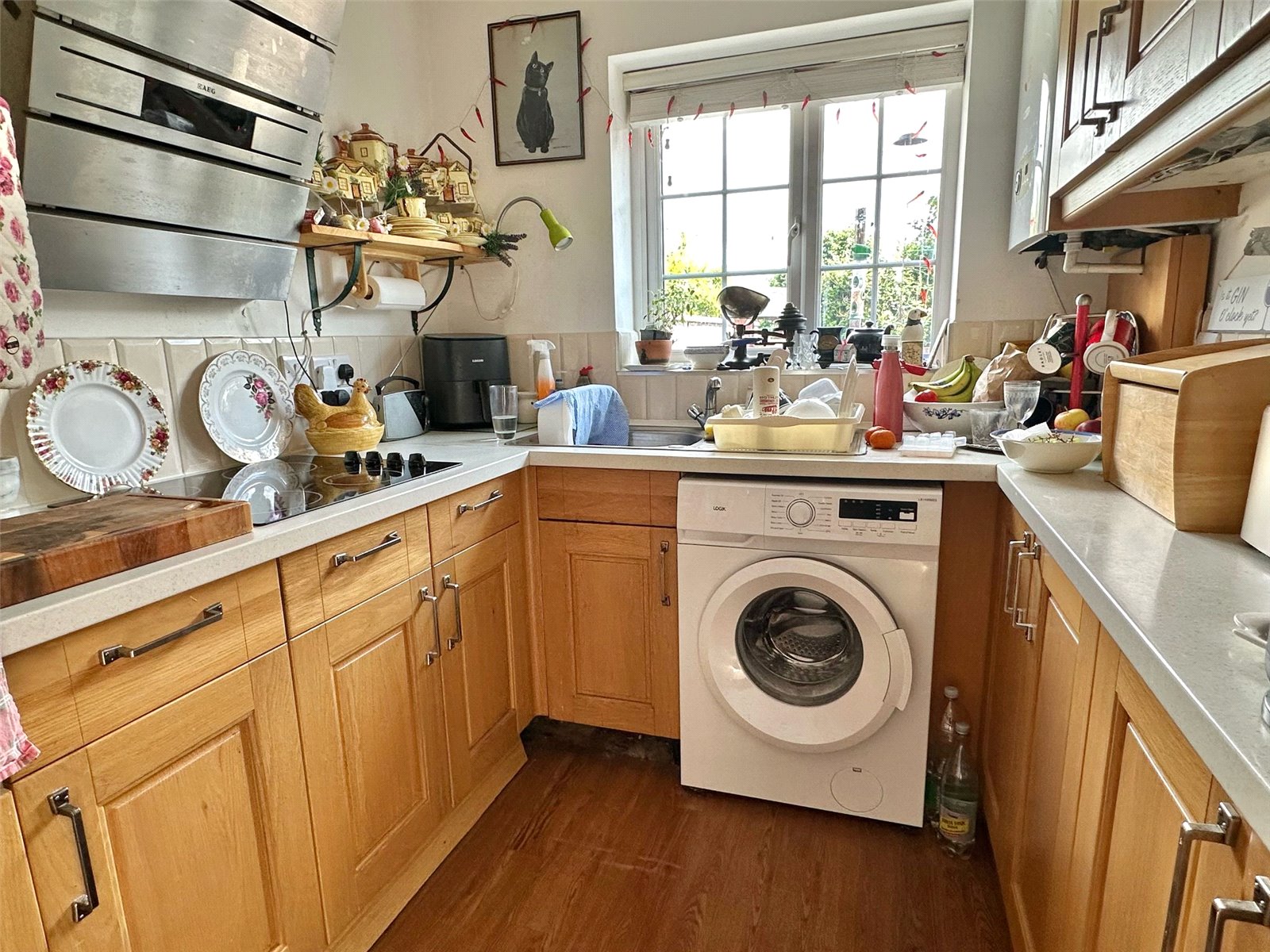 Comprising single bowl single drainer mixer tap sink unit set into a work surface with base cupboard and drawer units, matching eye level cupboard units, integrated double oven with adjacent electric hob and extractor, space and plumbing for washing machine, space for fridge/freezer, UPVC double glazed window overlooking the sun terrace, ceiling light point, wall mounted Glow Worm gas fired central heating boiler, central heating radiator