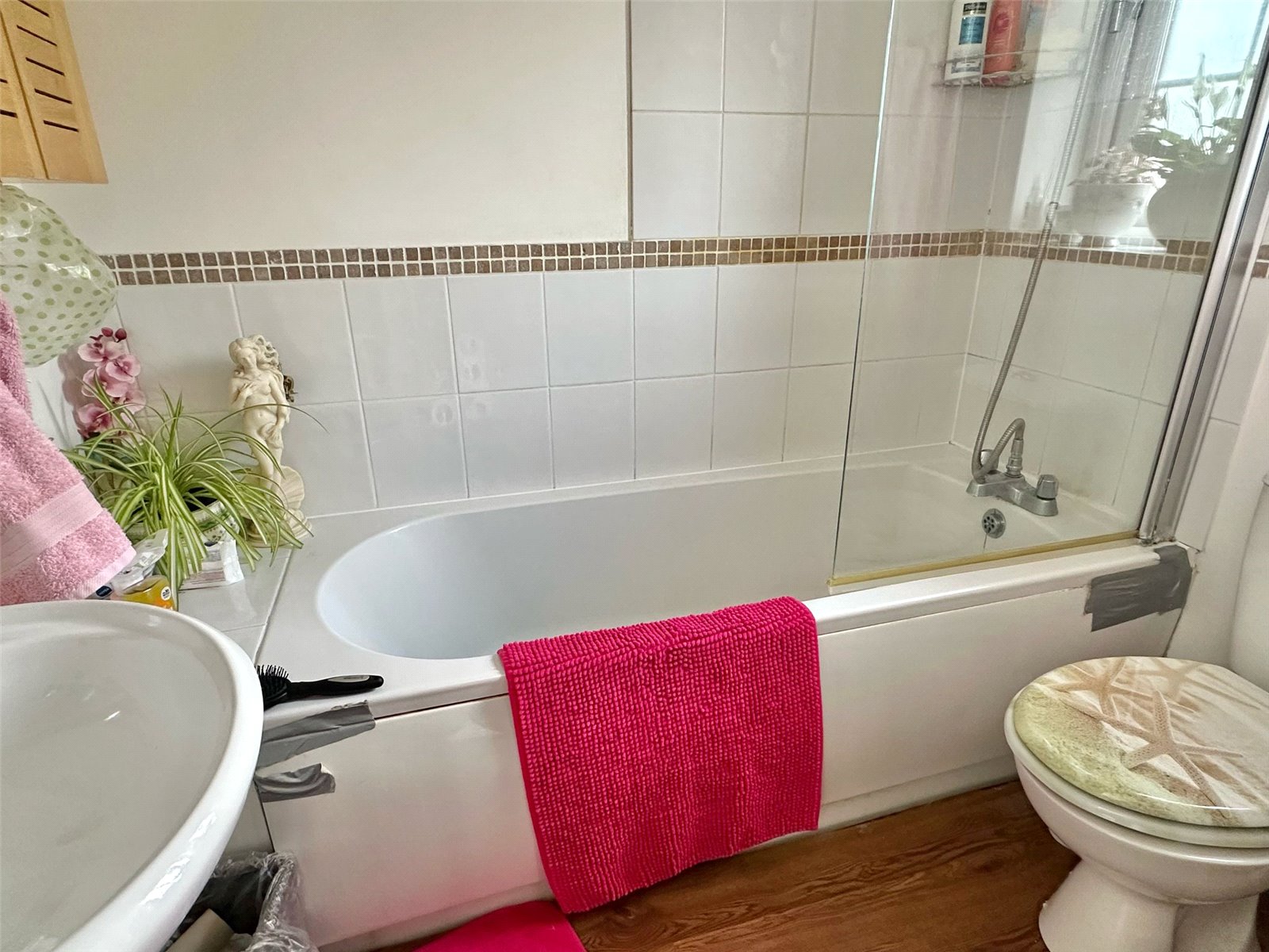 Comprising bath with mixer tap shower and shower screen, wc, wash hand basin, ceiling light point, obscure UPVC double glazed window, heated towel rail