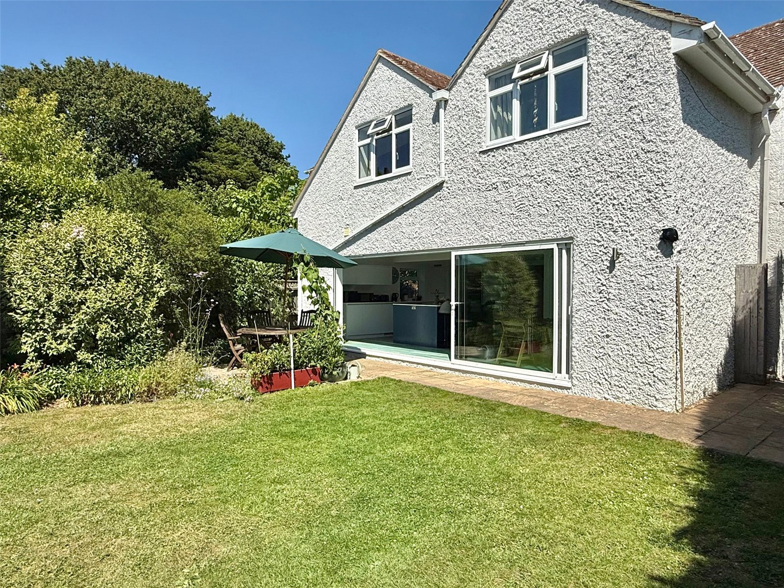 The west facing rear garden has an area of patio with direct access from the Kitchen/Dining Room, predominantly laid to lawn with mature tree and shrub borders, two raised vegetable plots, additional patio area at the rear of the garden leading to the garage, close panel fenced boundaries
