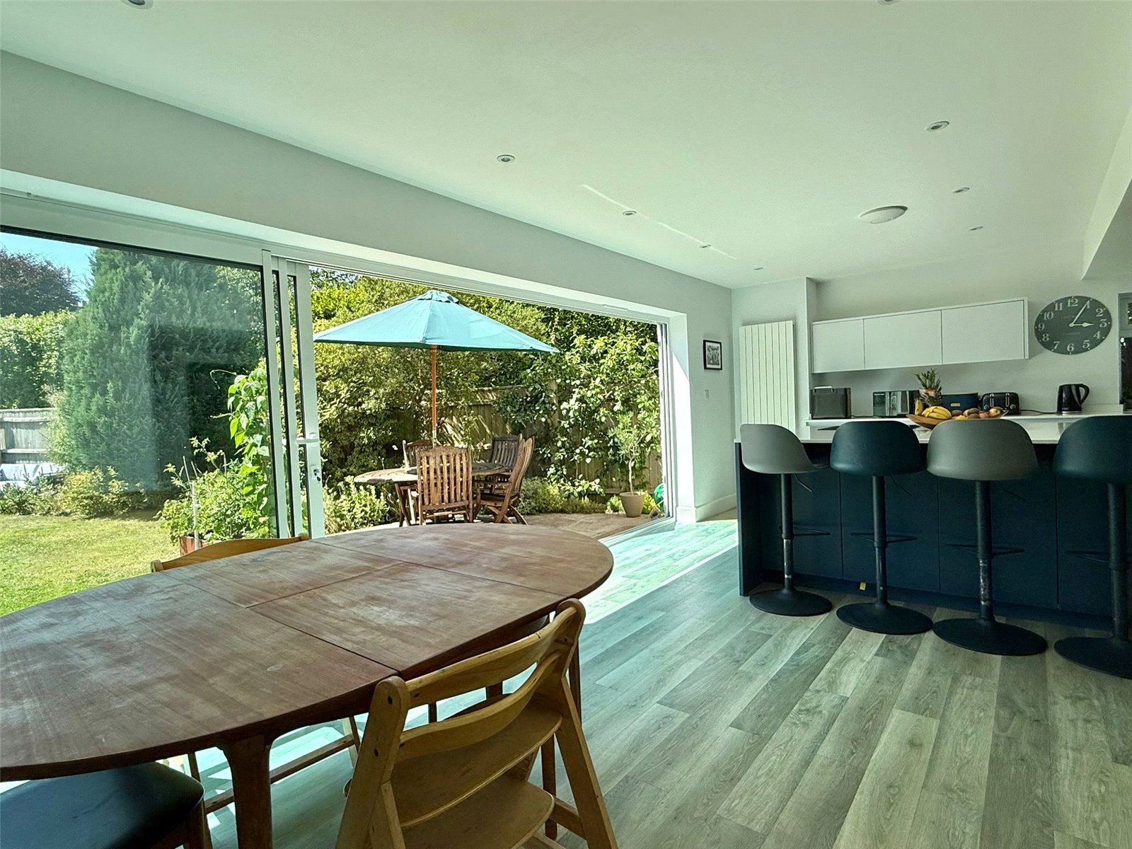 Free flowing access leads to the Dining Area with a good range of built in storage and drawer units, superb aluminium large double glazed sliding patio doors overlooking and leading on to the west facing rear garden and patio, recessed ceiling spotlighting, central heating radiator, free flowing access leading to: