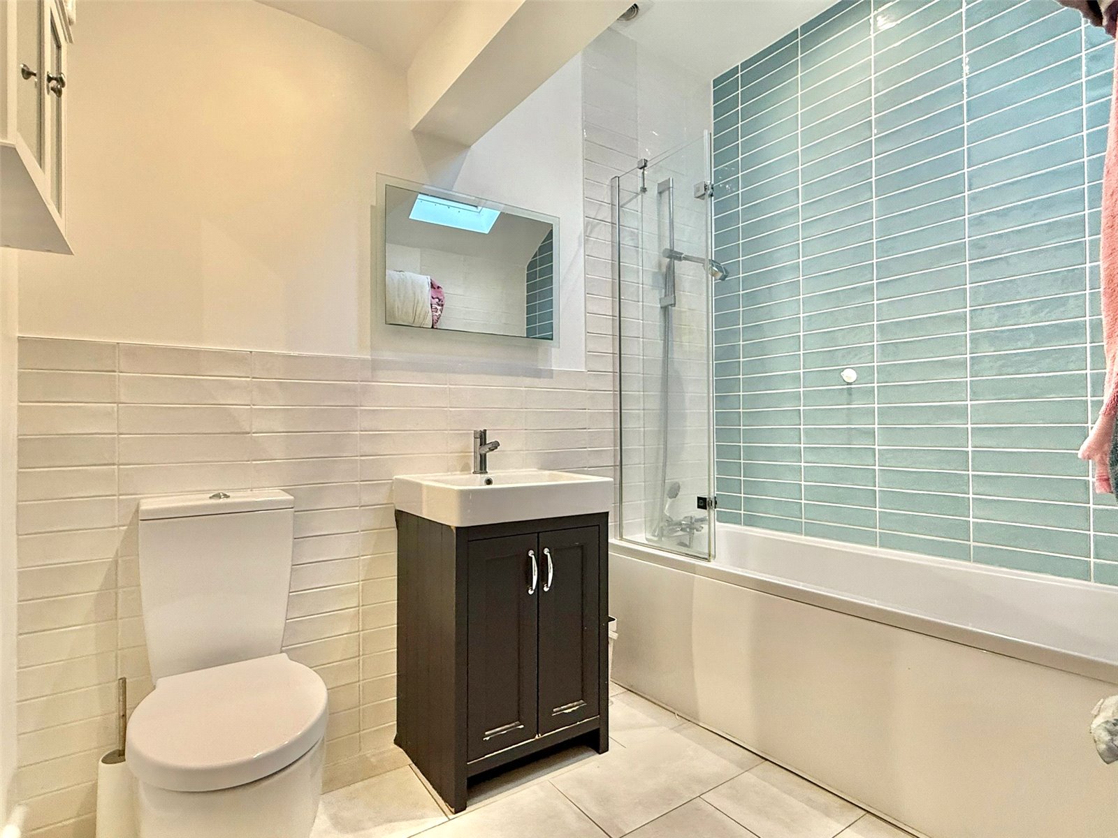 Feature bath with fitted shower and shower screen, vanity wash hand basin with mirror over, wc, heated towel rail, Velux double glazed window, part tiled walls