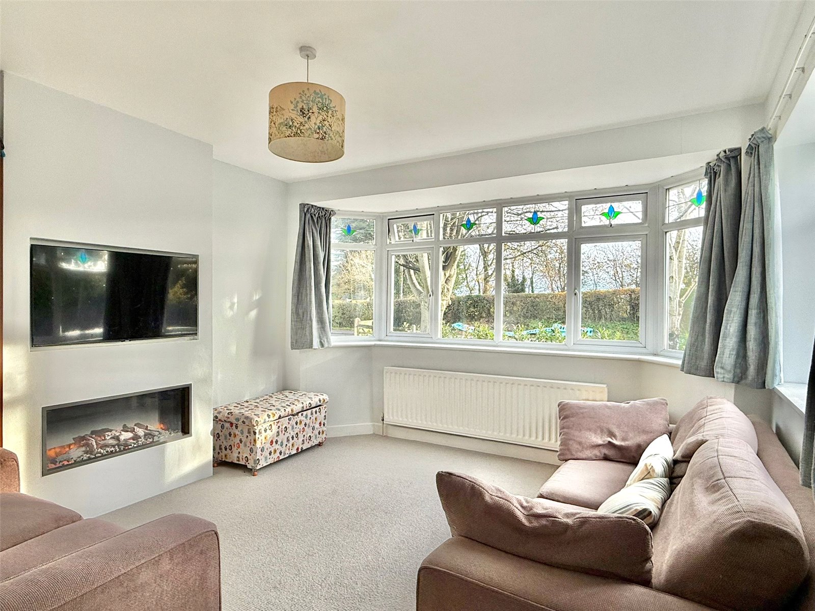 A light dual aspect room with large UPVC double glazed bay window overlooking the front aspect, further UPVC double glazed window to the side aspect, ceiling light point, central heating radiator, feature fireplace with inset electric fire, TV aerial point
