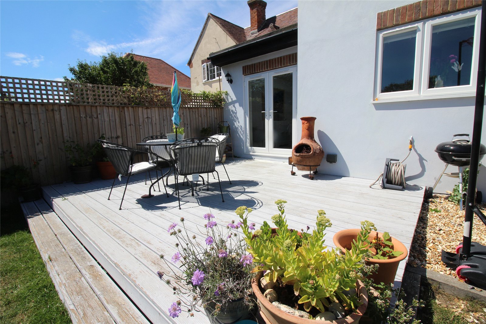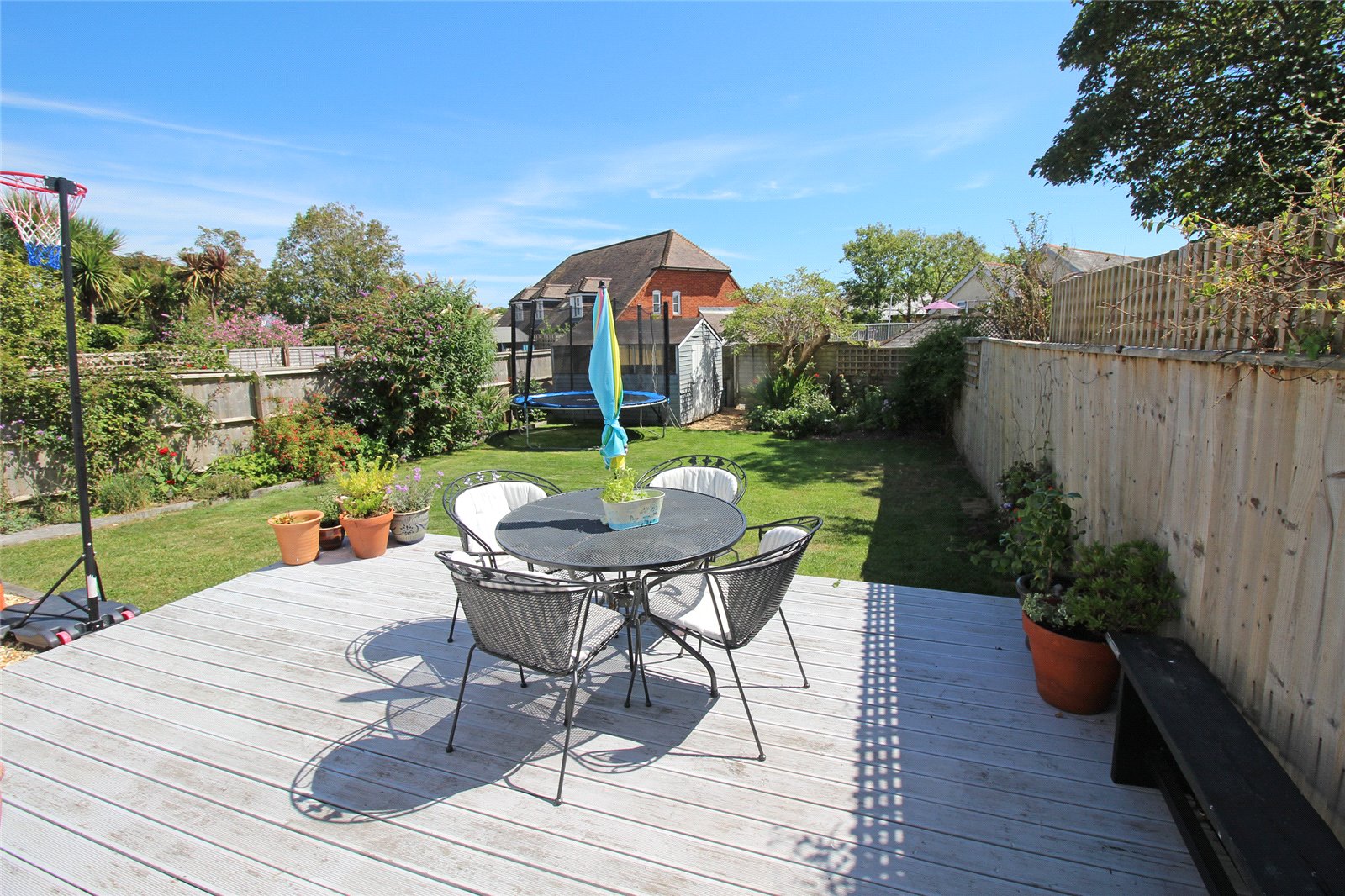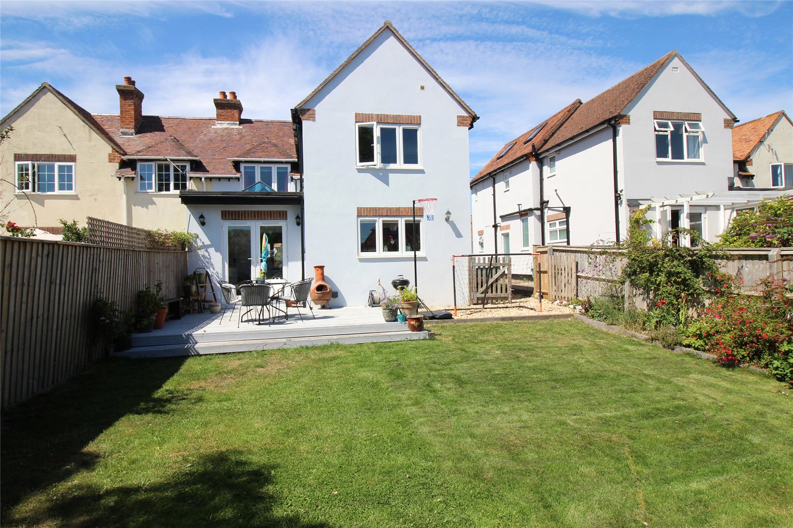 Shingled approach to the front entrance with adjacent shrub bed and a deep shingled driveway to the side of the property with timber gates giving access to the rear garden which is a fantastic feature of this fine property with its southerly aspect, a good sized area of decking immediately adjacent to the double opening doors from the Kitchen/Lifestyle Living Space with the remainder laid to lawn with shrub/flower bed borders, large timber garden store, panel fence boundaries, outside lighting, cold water tap, power point