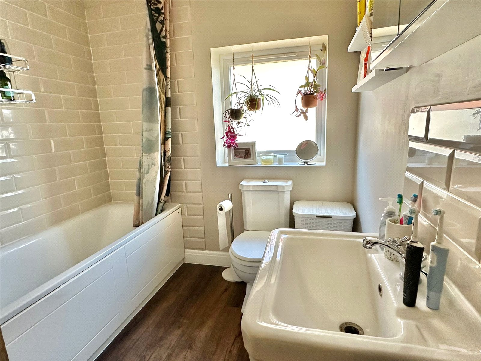 BATHROOM: 8'1" x 6'10" (2.46m x 2.08m) maximum measurements - comprising bath with fitted shower, wc, wash hand basin, shaver point, recessed ceiling spot lighting, extractor obscure UPVC double glazed window, heated towel rail.