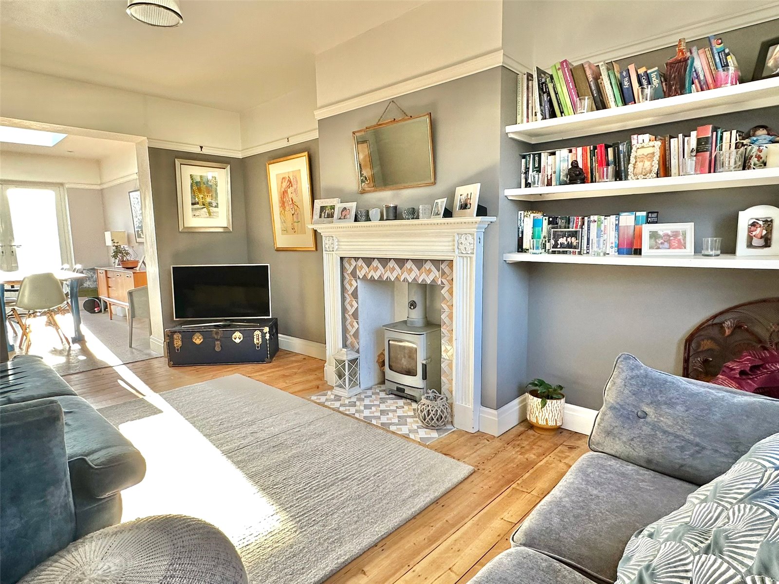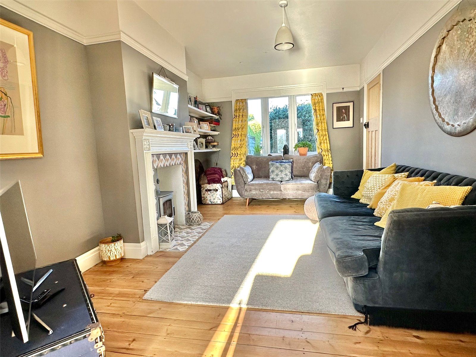 SITTING ROOM: 16'10" x 10' (5.13m x 3.05m) - UPVC double glazed window to the front aspect, stylish period central fireplace with a moulded timber surround and mantle, tiled hearth, adjacent book shelving, TV point, timber flooring, ceiling light point, central heating radiator