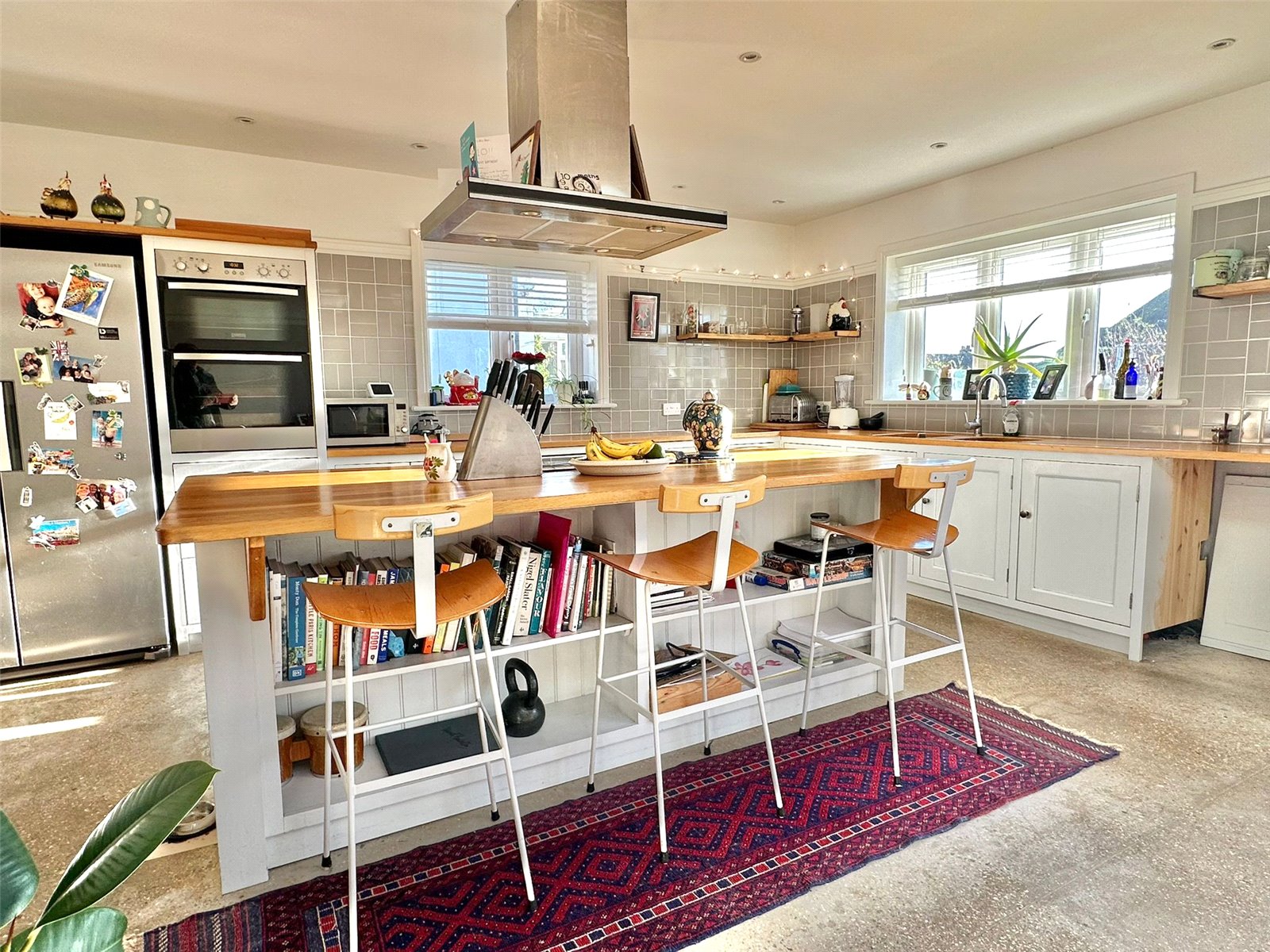 KITCHEN/DINING/LIFESTYLE LIVING SPACE: 21'1" x 18'3" (6.43m x 5.56m) - the heart of the home with the kitchen comprising double bowl mixer tap sink unit set in a timber work surface with base cupboard and drawer units and matching central island and breakfast bar, integrated double oven, space for American style fridge freezer, five ring induction hob with extractor over, space and plumbing for dishwasher, double aspect UPVC double glazed windows, recessed ceiling spot lighting, underfloor heating, ample space for large dining table and chairs and/or soft furnishings, further UPVC double glazed double opening doors overlooking and leading onto the southerly aspect rear garden, lantern ceiling window, TV point