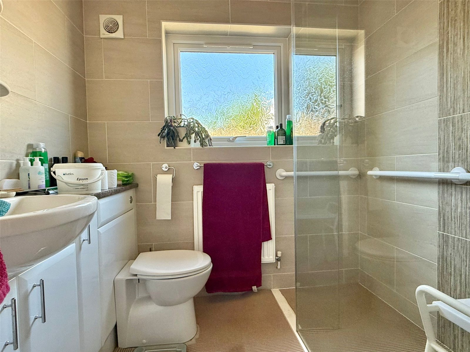 Large walk in shower with overhead rain water shower rose, tiled surround, tiled flooring, concealed cistern wc with vanity wash hand basin and toiletry cabinet and mirror above, recessed ceiling spotlighting, UPVC obscure double glazed window, central heating radiator