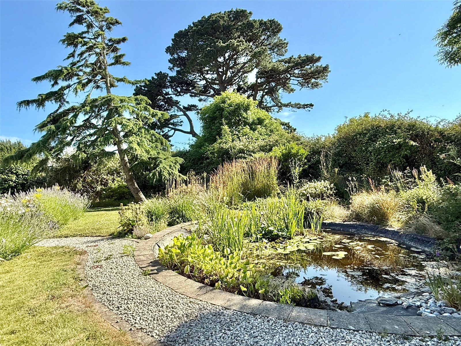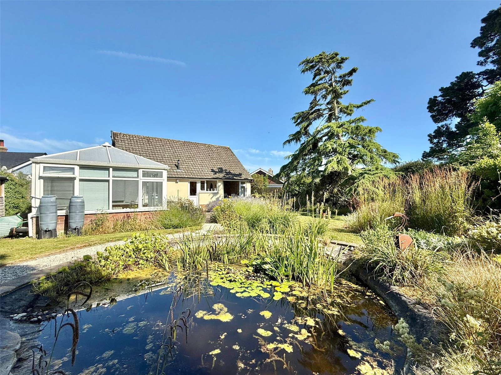 The delightful south west facing rear garden is superb, secluded and private. It has direct access from the Kitchen door that leads on to a paved terrace, a personal door to the garage and a standalone Conservatory. The majority of the garden is laid to lawn with interesting borders, an abundance of flowers and specimen plants with a stone shingle pathway leading to the feature pond at the rear, side access to the front from both sides, Timber Garden Shed.