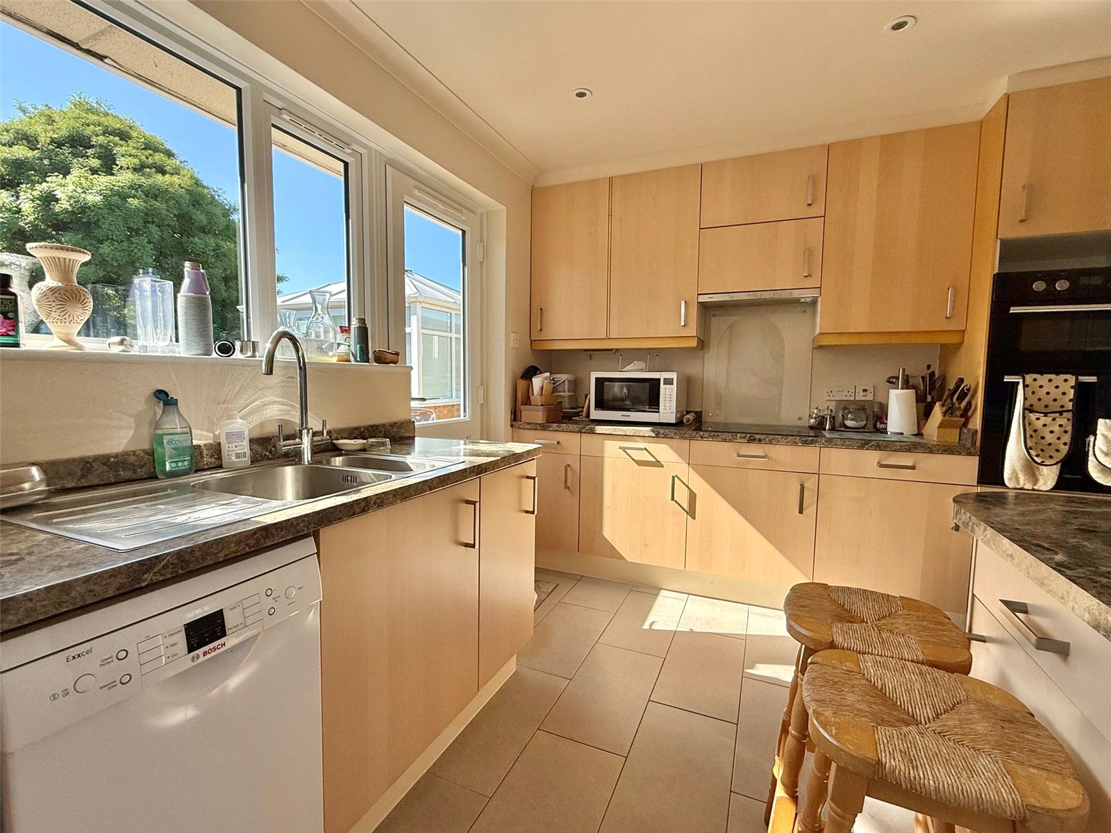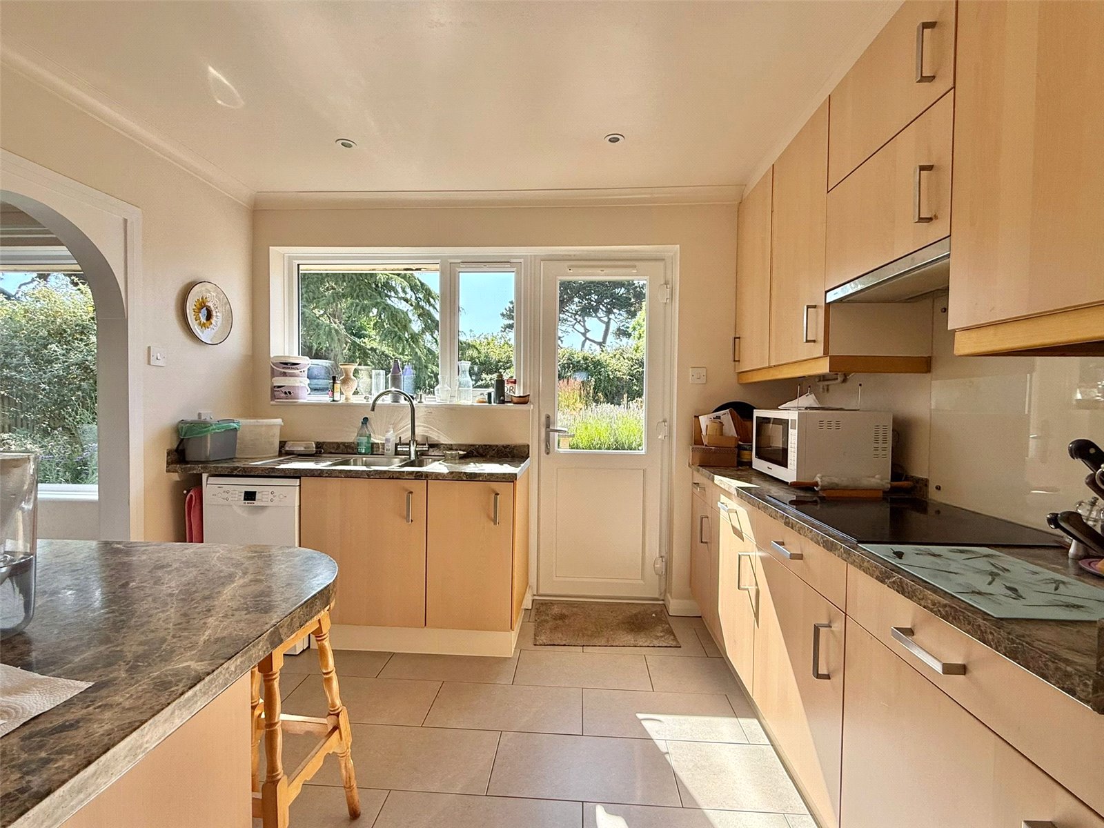 UPVC double glazed window and door overlooking and leading on to the rear garden, recessed ceiling spotlighting, one and a half bowl single drainer mixer tap stainless steel sink unit set in a work surface with base cupboard and drawer units, matching eye level cupboard units, four ring induction hob, extractor, integrated double oven, space for fridge/freezer, space for slimline dishwasher, pull out larder rack, breakfast bar work surface, wall mounted gas fired Worcester central heating boiler housed in an eye level cupboard unit, tiled flooring
