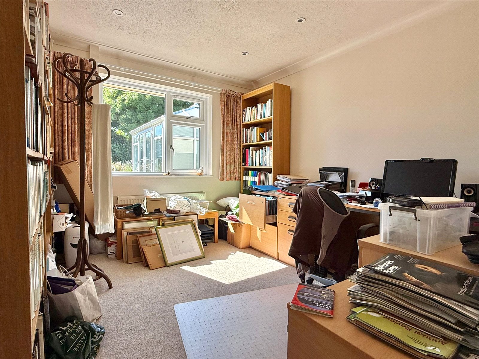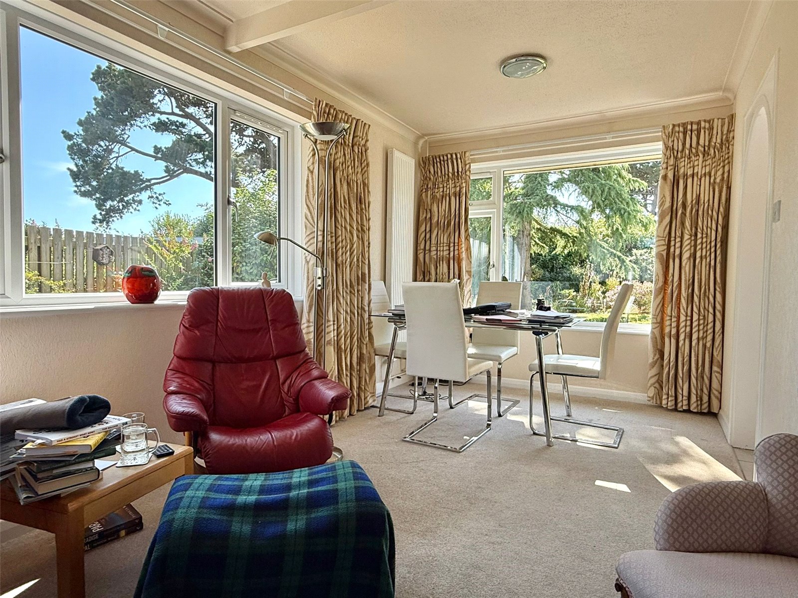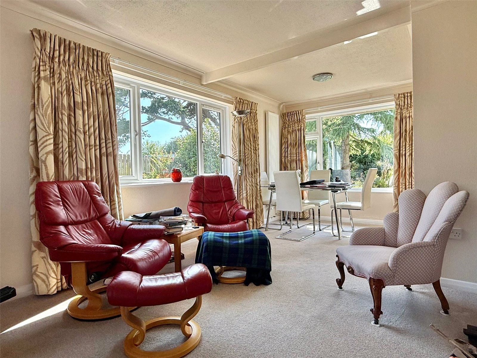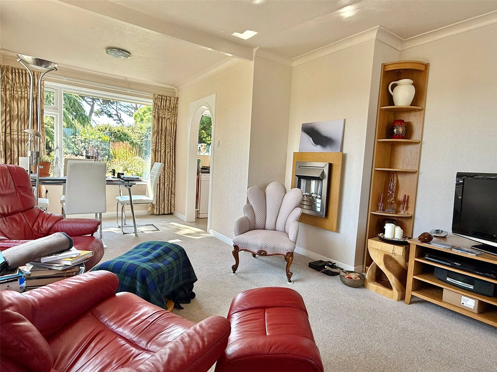 A triple aspect room with UPVC double glazed windows overlooking the front, side, and delightful rear garden, ceiling light points, central heating radiators, insert electric living flame fireplace, TV point, BT aerial point, and arched free flowing access to: