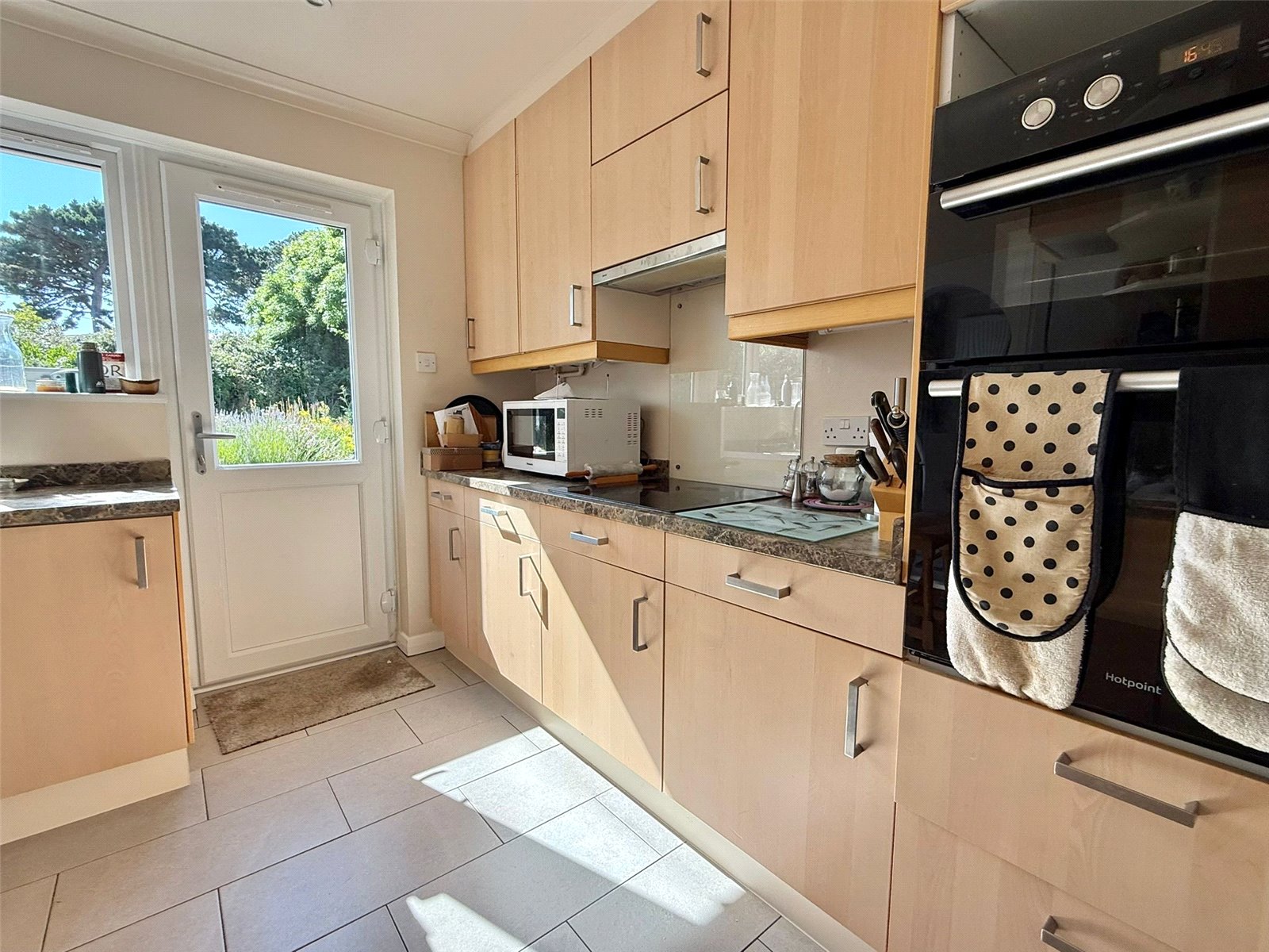 UPVC double glazed window overlooking the rear garden, recessed ceiling spotlighting, central heating radiator