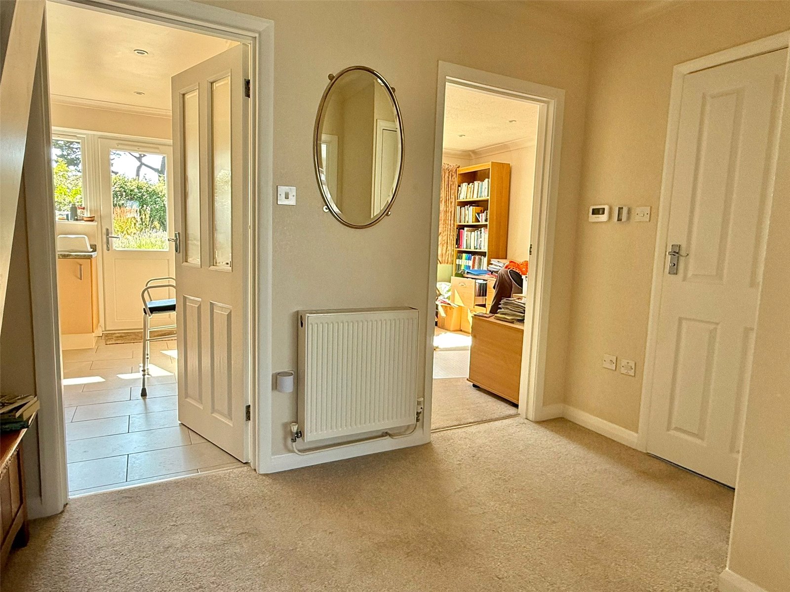 ENTRANCE HALL with recessed ceiling spotlighting, central heating radiator, cupboard, understairs wine cupboard, cupboard housing the electric meter and fuseboard, doors leading to: