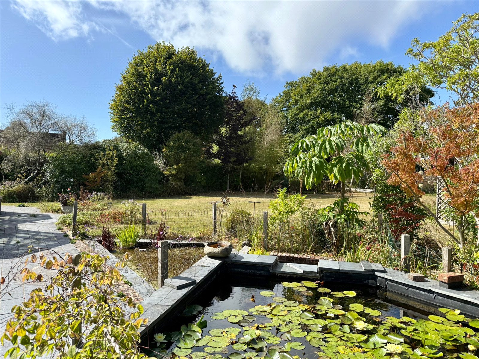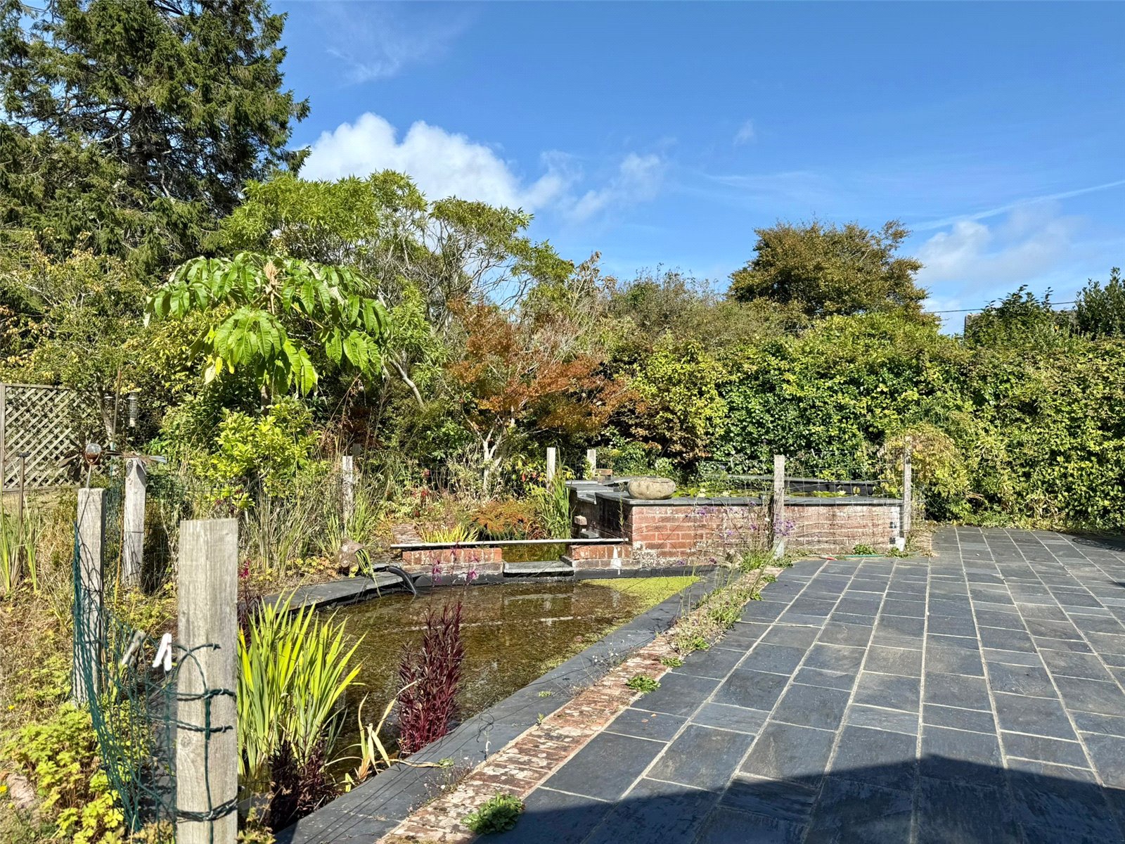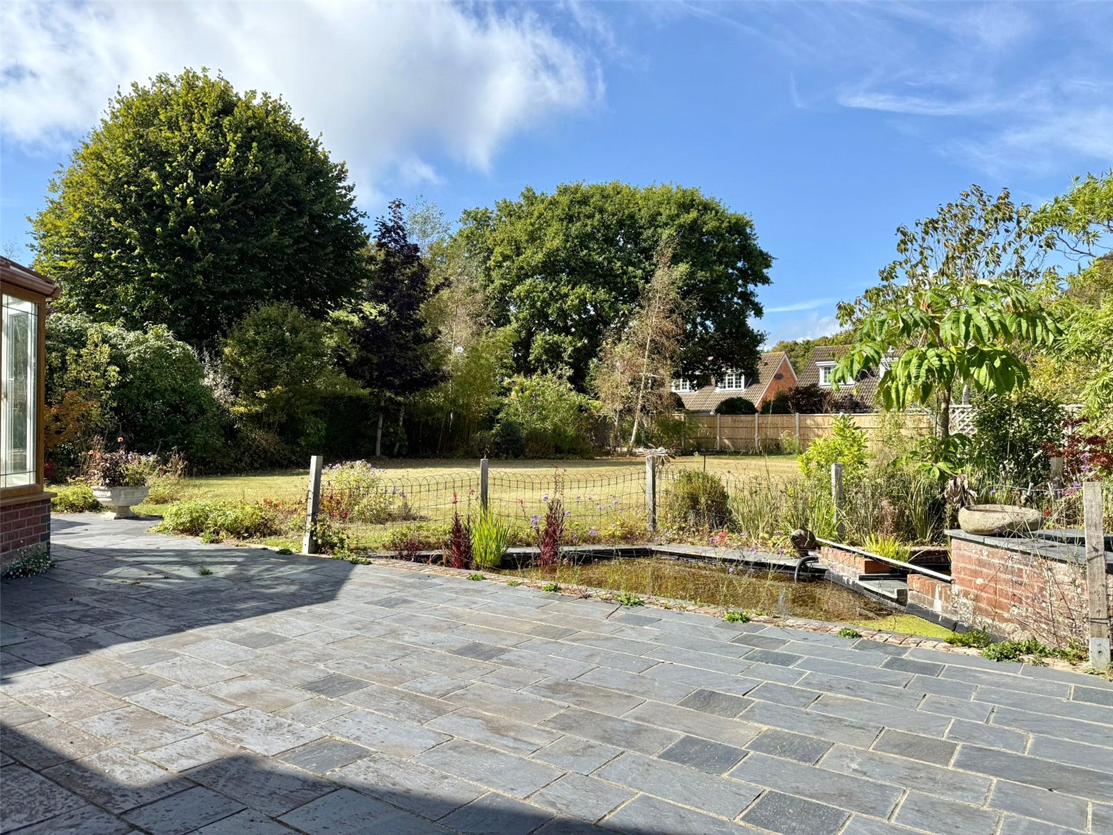 The large rear garden ha a paved Terrace running adjacent to the property accessed from the Sitting Room and Conservatory leading on to lawn with deep shrub/flower bed and specimen tree borders and boundaries, with a rear fenced boundary, adjacent to the terrace is a pond feature.