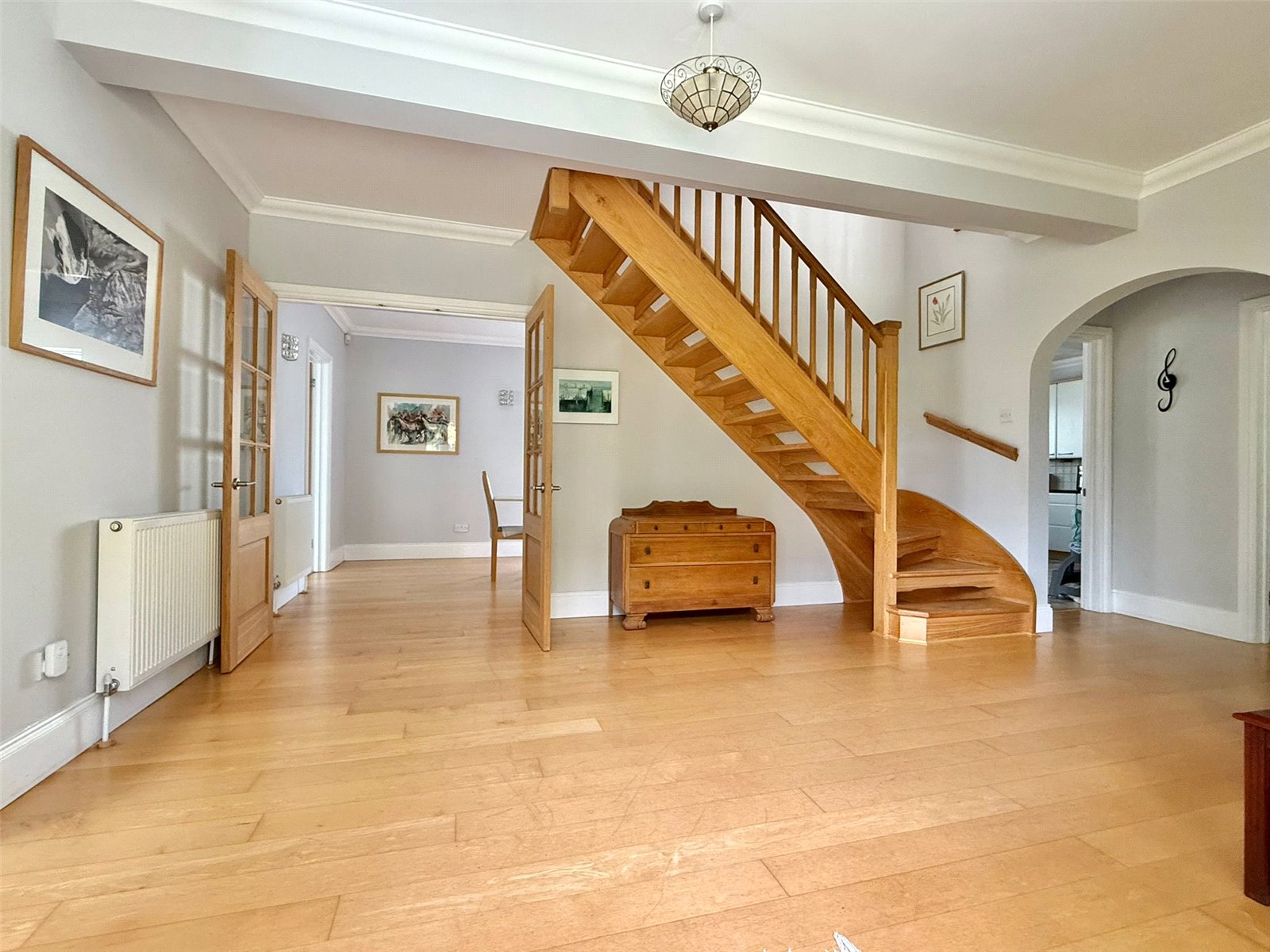 Continuation of the oak effect flooring, ceiling and wall light points, central heating radiator, double opening doors leading to: