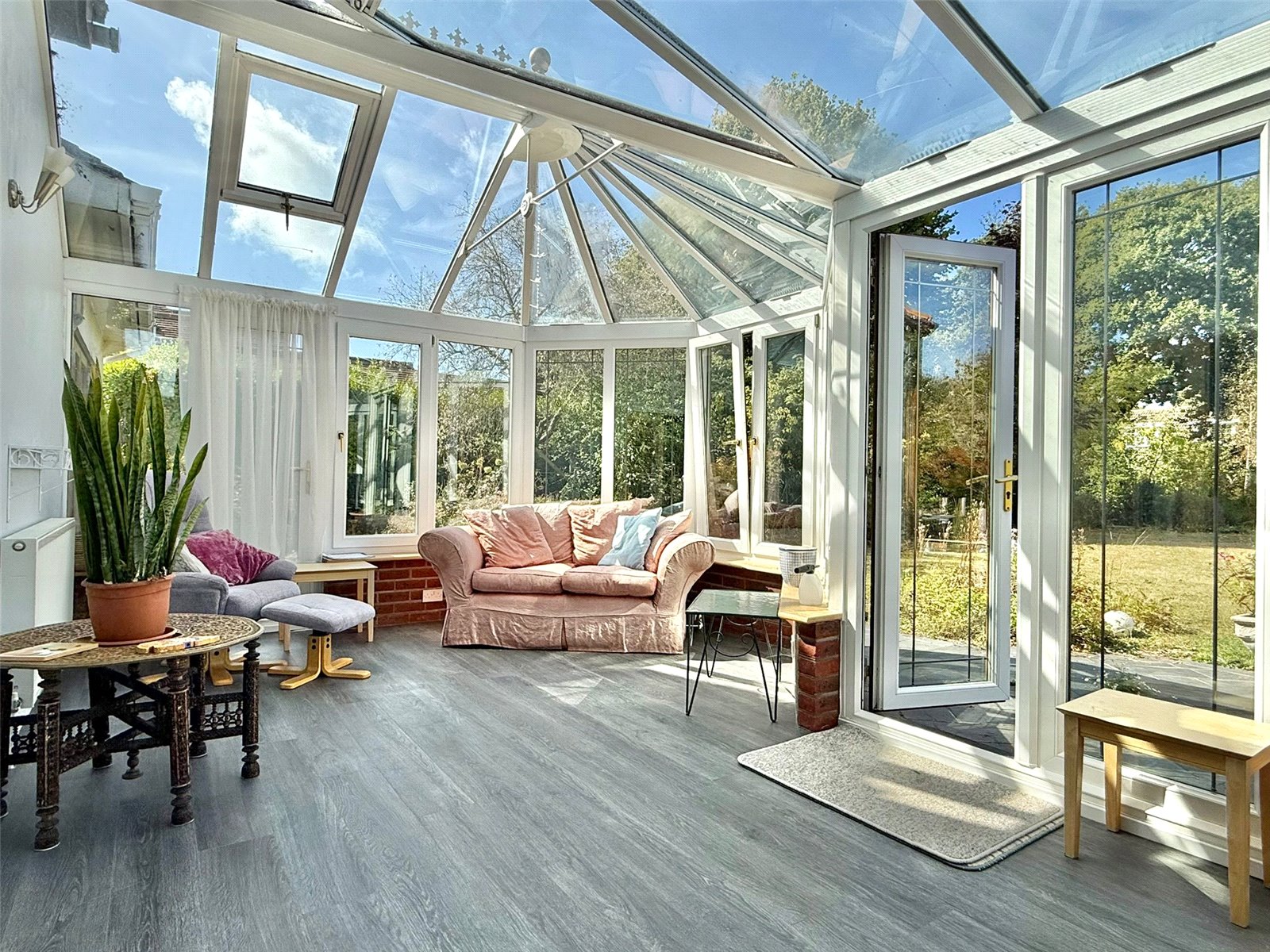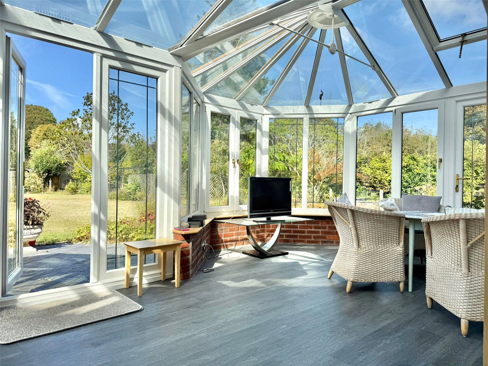 Dwarf based with UPVC double glazed windows and doors opening and overlooking the good sized south facing rear garden, glazed roof, central heating radiators, power points, TV point, wall light points