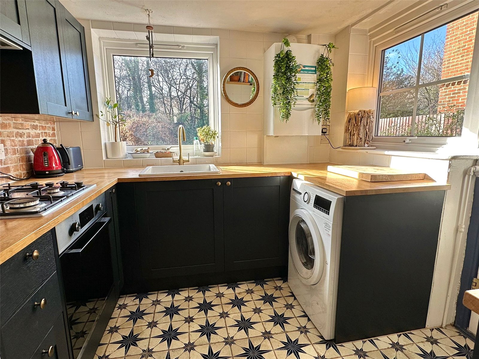 Comprising mixer tap sink set into a timber worksurface with base cupboard and drawer units and matching eye level cupboard units, integrated oven, gas hob with extractor over, space and plumbing for washing machine, space for tall fridge freezer, ceiling light point, UPVC double glazed window, wall mounted gas fired central heating boiler, side aspect door.
