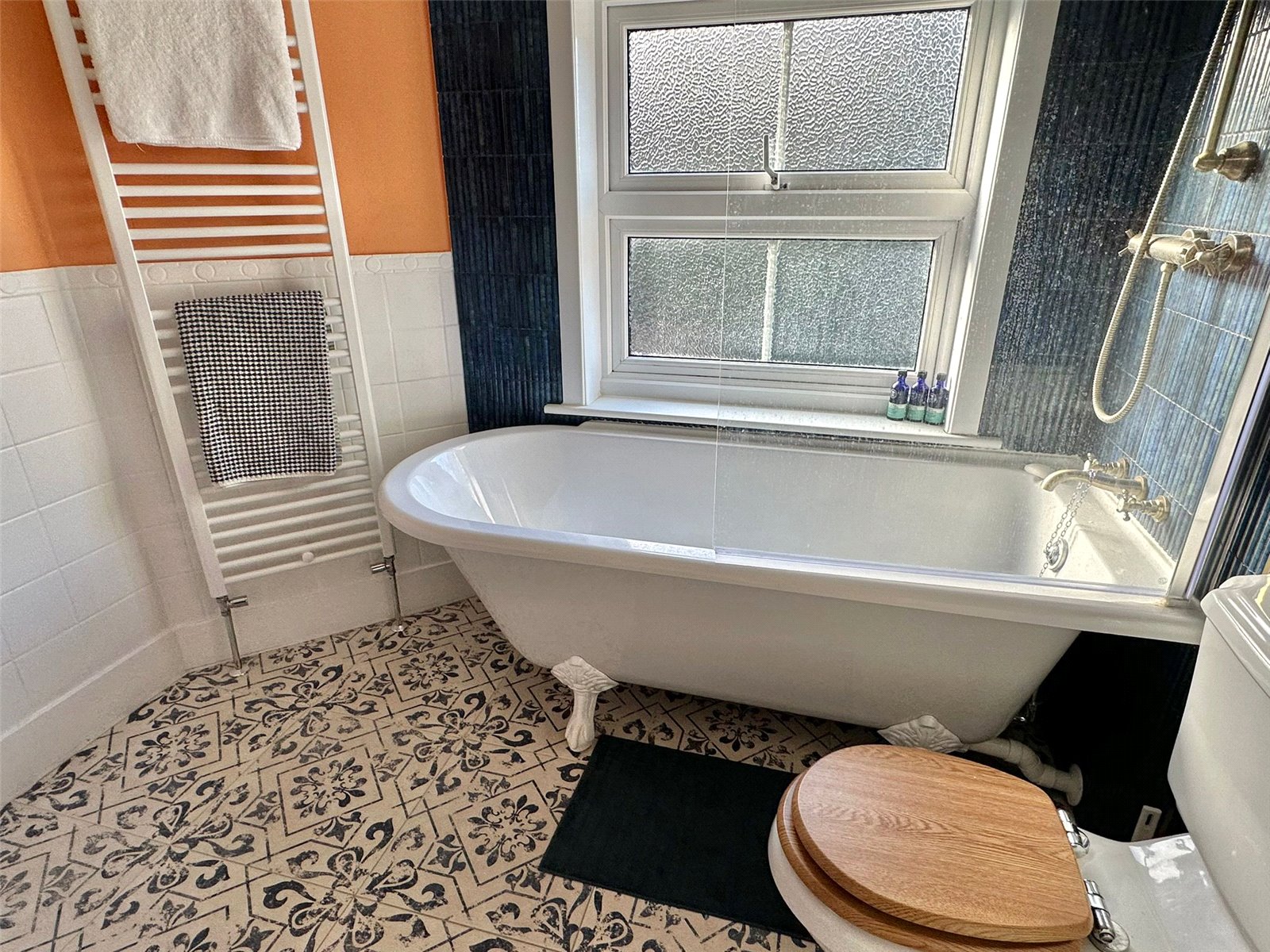 Claw foot bath with fitted shower and shower screen, wc, vanity wash hand basin, heated towel rail, ceiling light point, obscured UPVC double glazed window