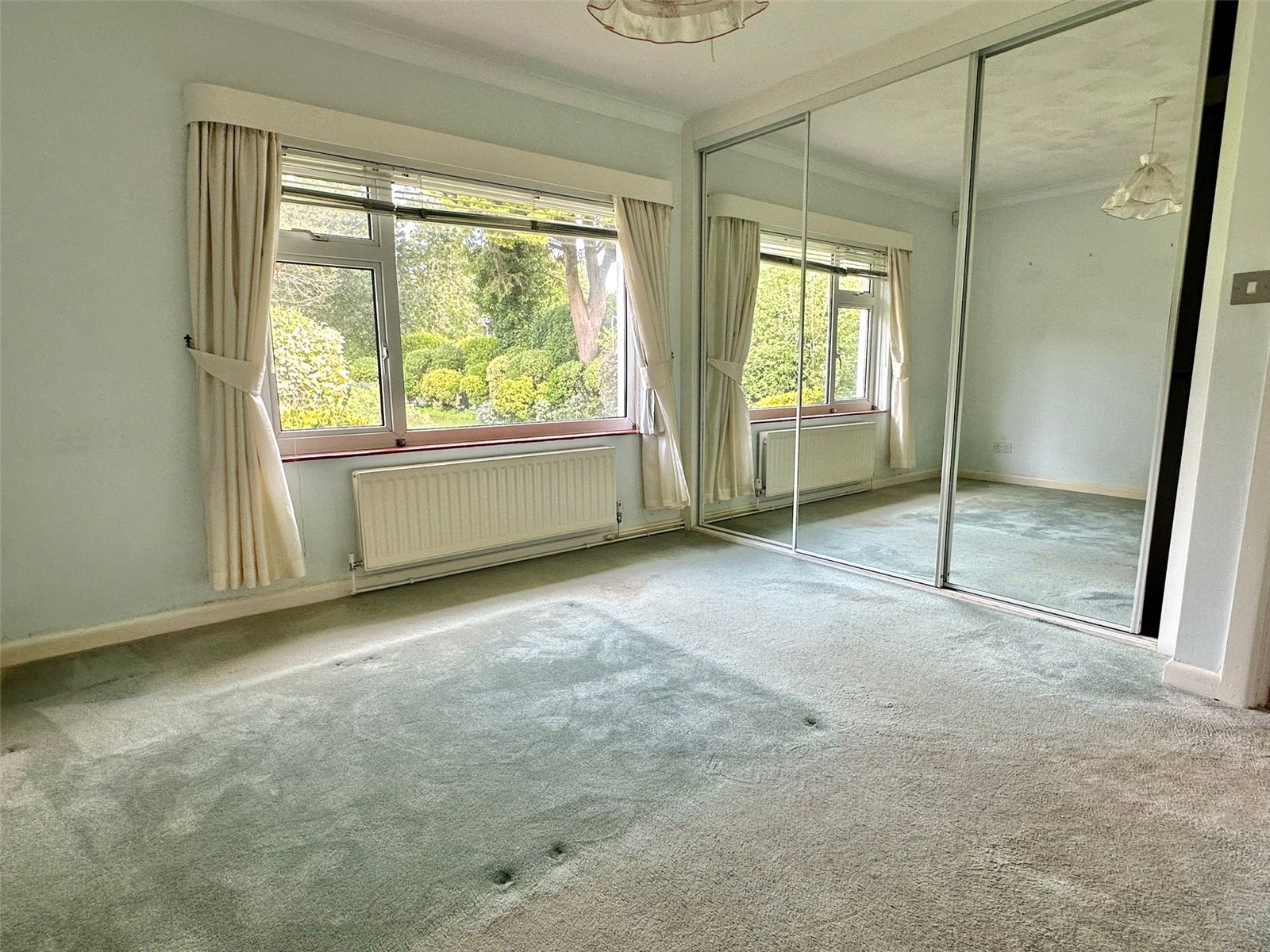 UPVC double glazed window overlooking the garden, central heating radiator, ceiling light point, built in double wardrobe, and door leading to: