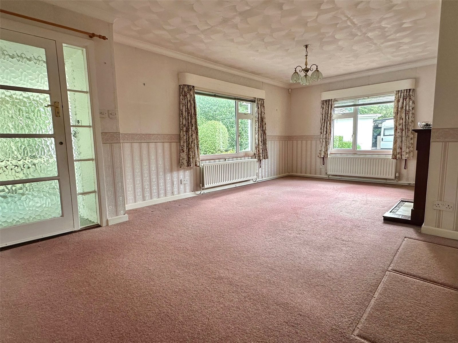 Double aspect UPVC double glazed windows, central feature fireplace with adjacent display recess, central heating radiators, ceiling light points, and door leading to: