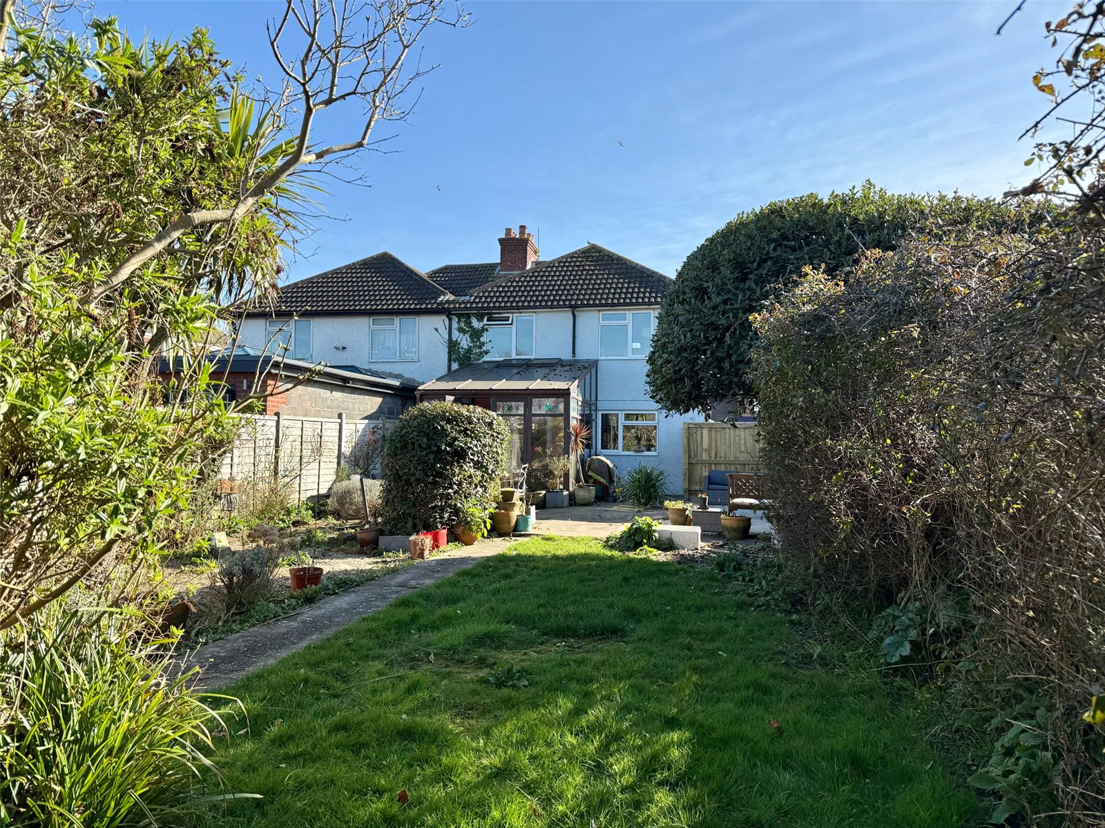 The front has a driveway providing plenty of off-street parking with the remainder laid to shingle with a low retaining front wall boundary, shrub border, side pedestrian gate giving access to the rear garden