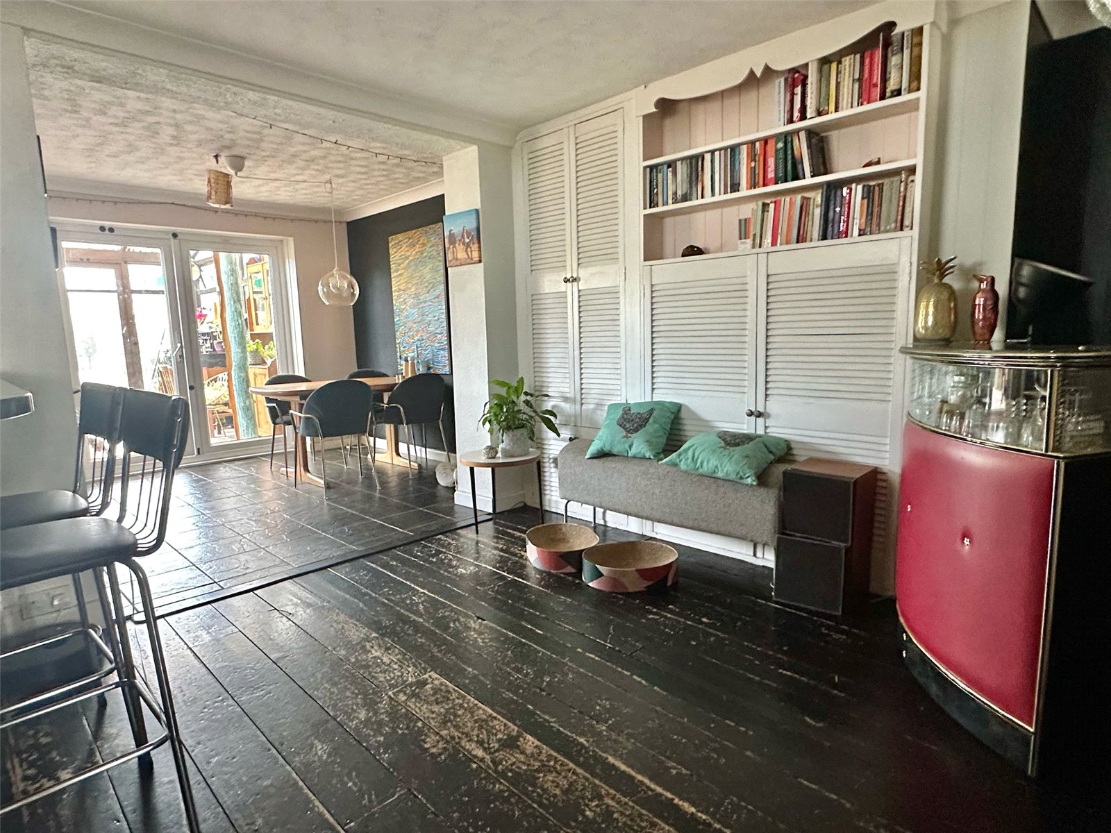 Full height double glazed windows and doors overlooking and leading on to the rear garden, tiled flooring, pitched polycarbonate roof
