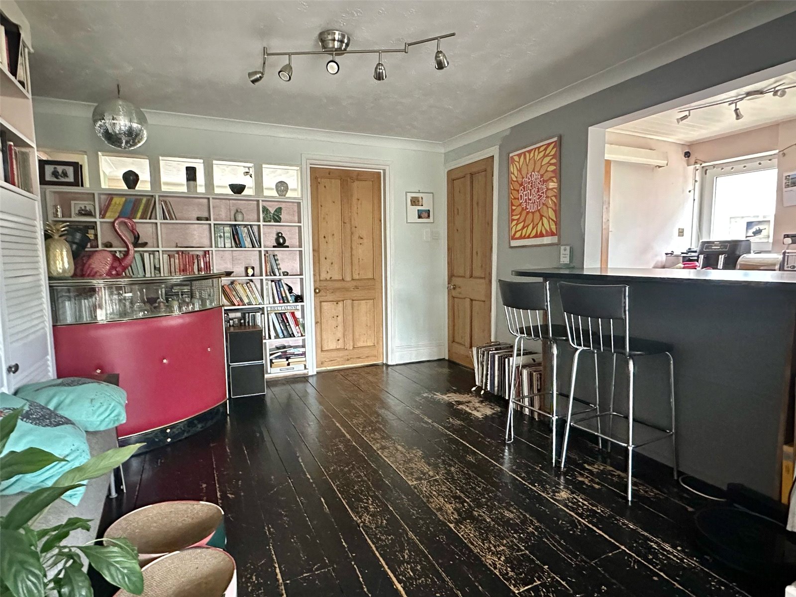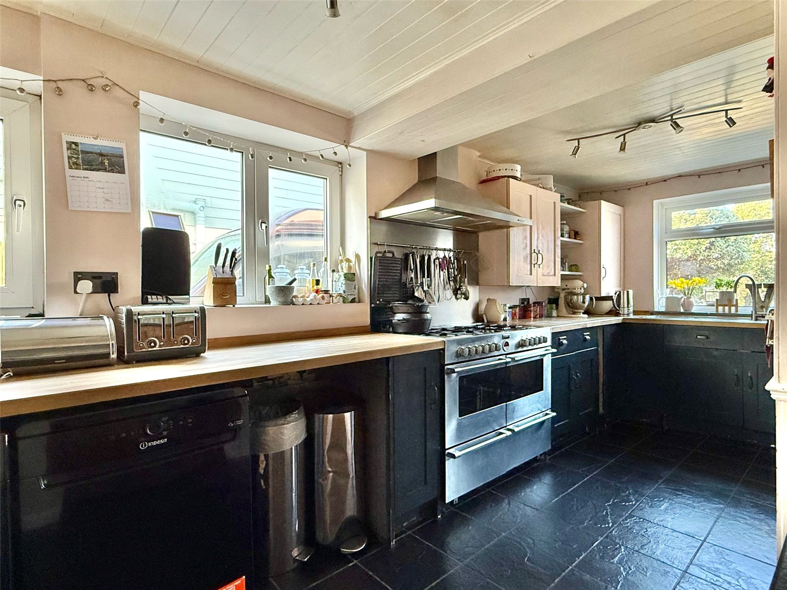 The heart of the home incorporating a kitchen with a double bowl single drainer mixer tap sink unit set in a timber work surface, base cupboard and drawer units, matching eye level cupboard units, integrated range style cooker with extractor over, space and plumbing for washing machine, dishwasher, space for tall fridge/freezer, tiled flooring, ceiling light point, UPVC double glazed windows, breakfast bar, space for good sized dining table and chairs, a further space for soft furnishings or entertaining with storage cupboard and book shelving, door leading to:
