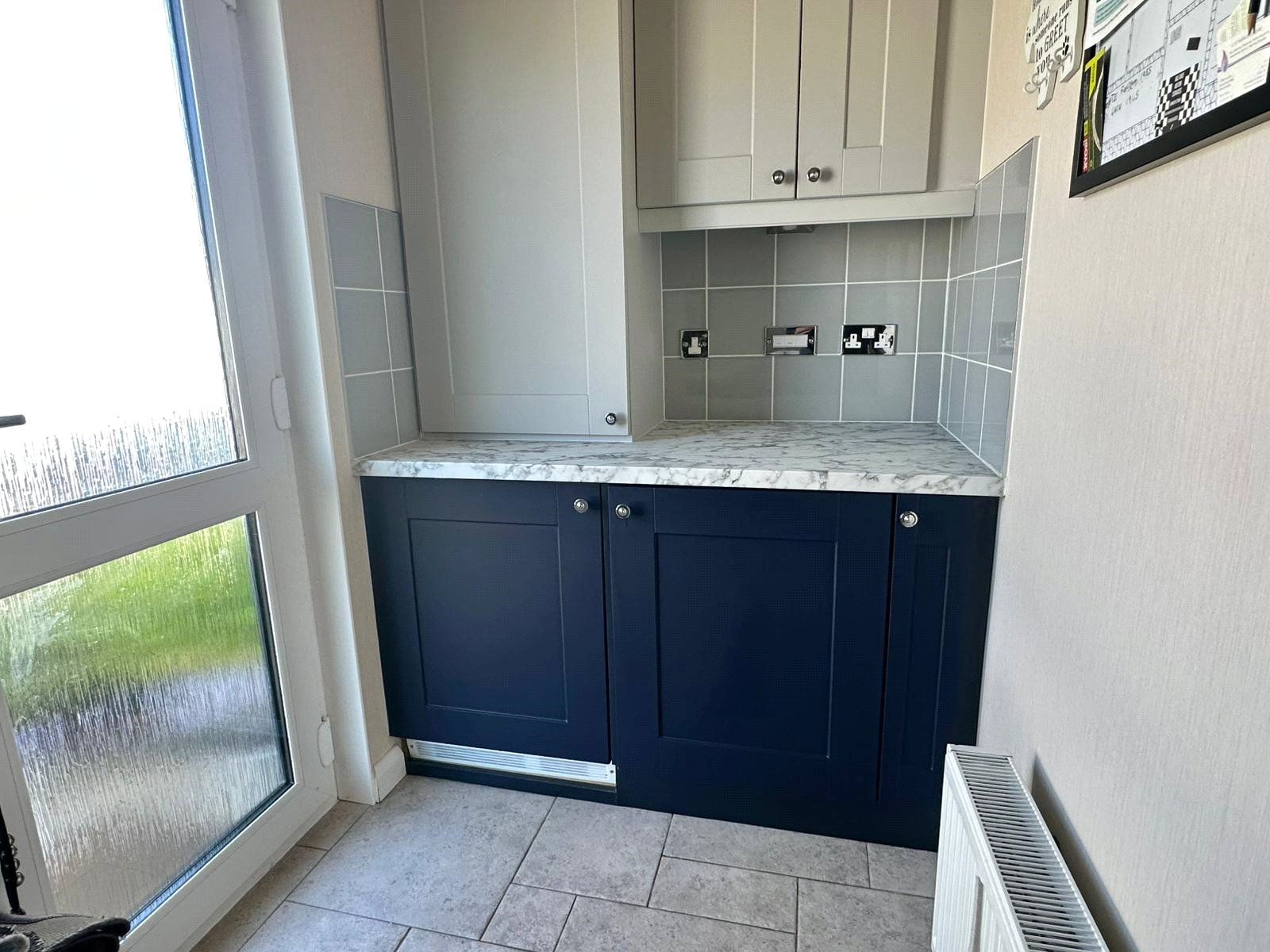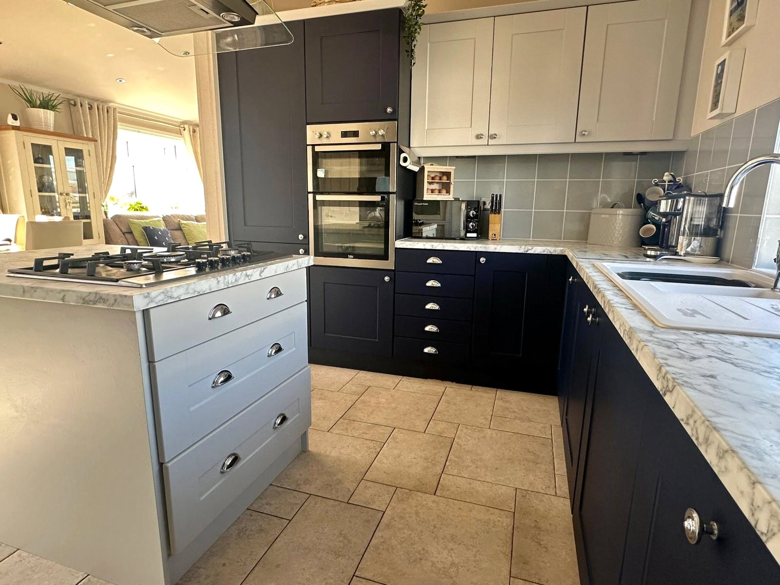 Comprising one and a half bowl single drainer mixer tap sink unit set into a work surface with base cupboard and drawer units, matching eye level cupboard units, matching island unit, integrated double oven, fridge/freezer, dishwasher, five ring gas hob with extractor set into the island unit, space and plumbing for washing machine and tumble dryer, wok surface lighting, recessed ceiling spotlighting, tiled flooring, central heating radiator, UPVC double glazed window and adjacent side aspect door, concealed in an eye level cupboard in the gas fired central heating boiler, space for good sized dining table and chairs, further radiator and UPVC double glazed window and free flowing access to: