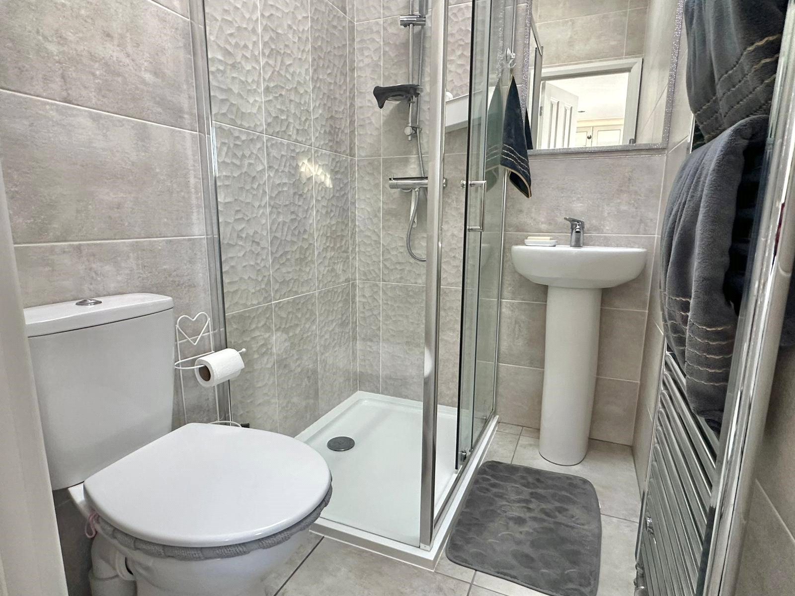 Comprising shower, wc, wash hand basin with shaver light point over, heated towel rail, tiled floor and walls, recessed ceiling spotlighting, extractor, UPVC double glazed Velux window