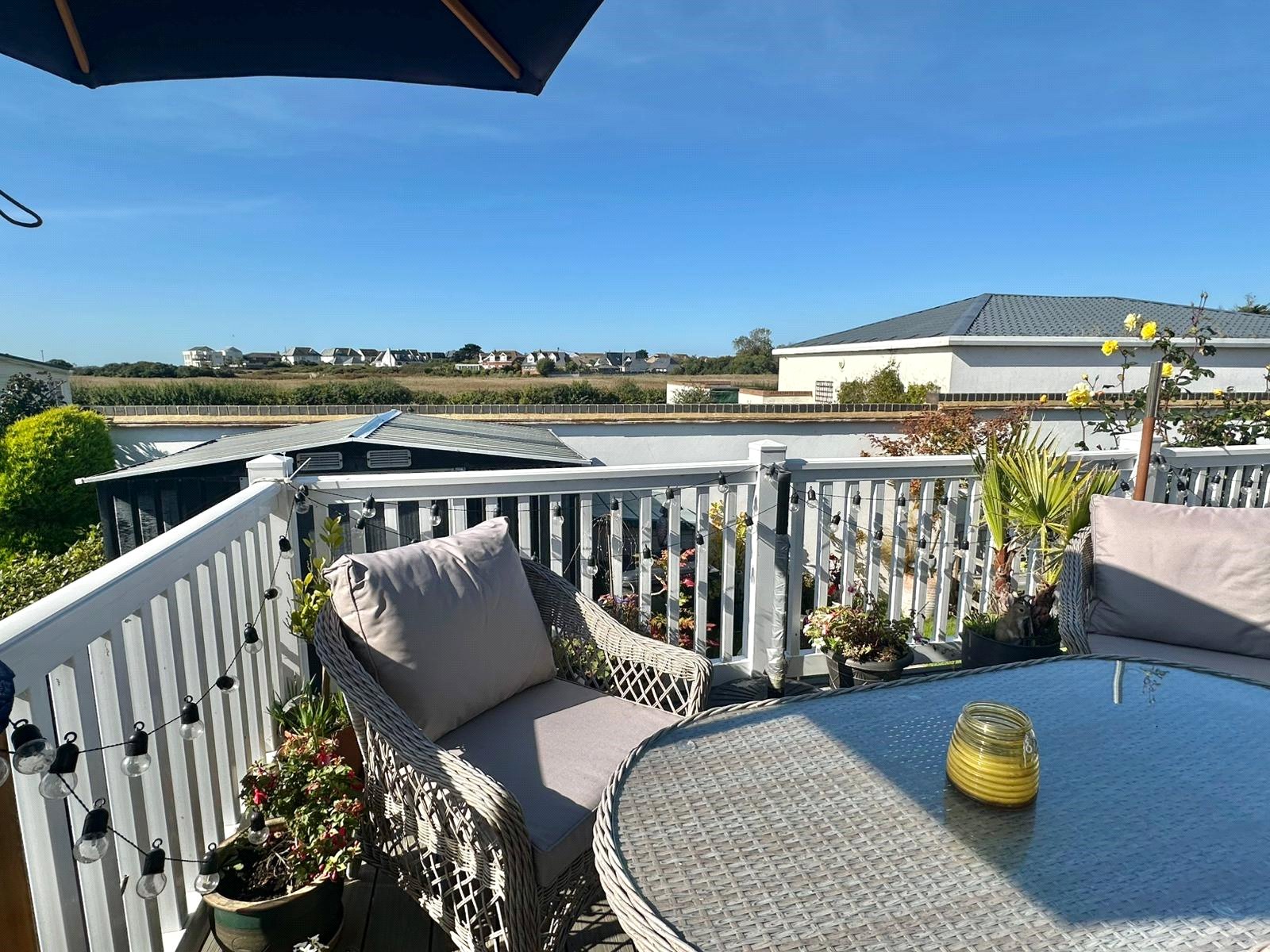 A driveway approach provides off street parking and leads to the steps and balustrade leading to the front door, paved footpath leads to the rear garden which is predominantly laid to lawn with a rendered brick wall boundary and natural side aspect boundaries with further steps and balustrade leading to the kitchen, further adjacent side access, outside lighting, cold water tap, The attractive balustraded Sun Terrace has access from Living Space with views over the garden, Sturt Pond Reed beds, and the coastal aspect beyond. Furthermore there is a good sized Garden Store