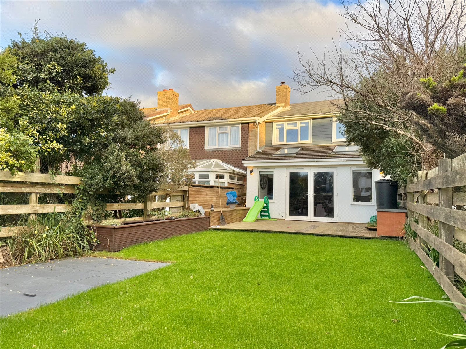 Pathway leads to the front entrance with the remainder of the front laid to lawn with shrub borders. The rear garden has a westerly aspect, an area of decked terrace with a seating feature incorporating storage immediately adjacent to the property with the remainder laid to lawn, fenced boundaries, rear pedestrian gate, outside lighting