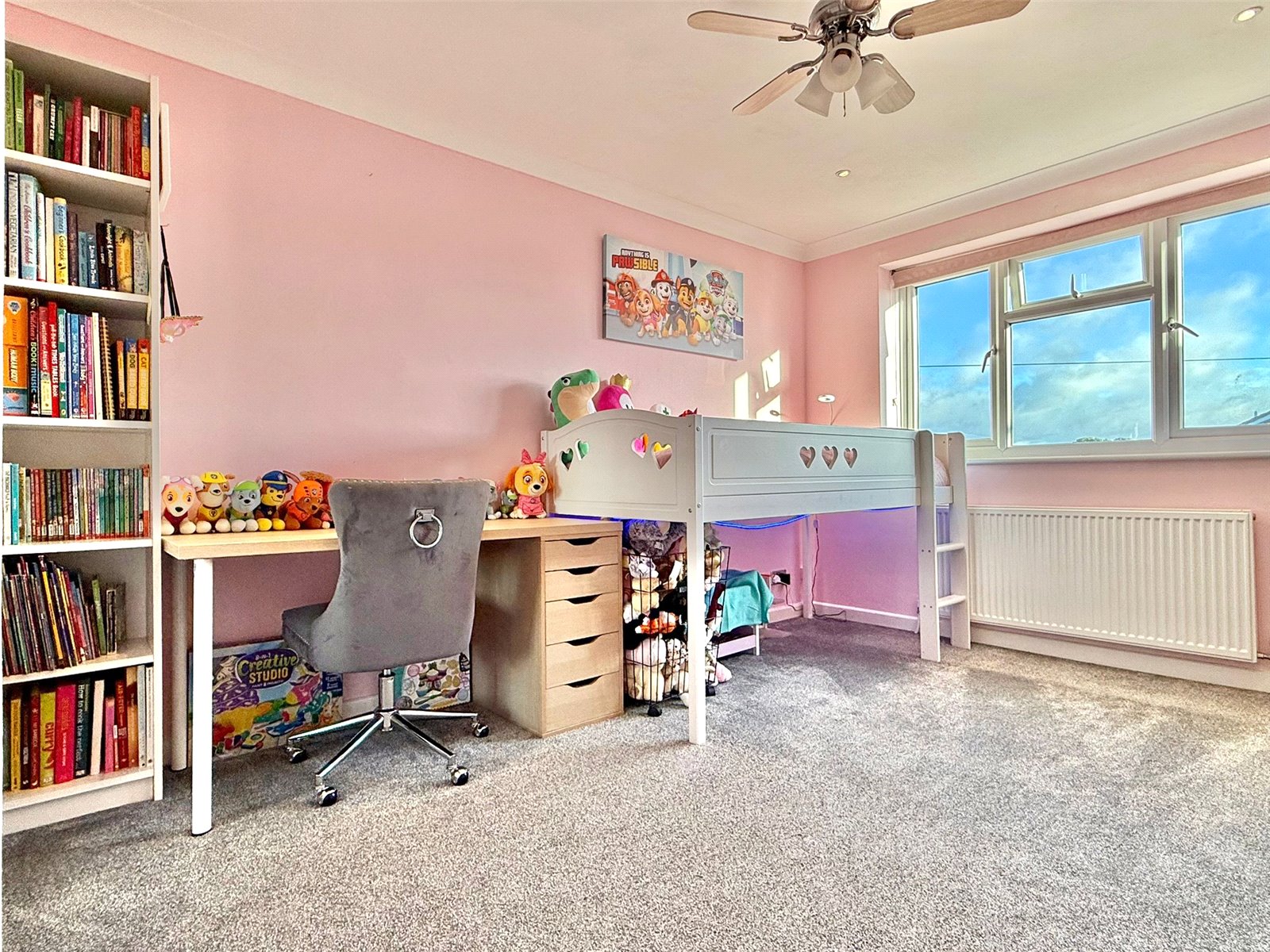 BEDROOM TWO: 14'8" into the wardrobe recess x 9'10" (4.47m x 3m)- UPVC double glazed window to the front aspect, central heating radiator, recess ceiling spotlighting, ceiling fan