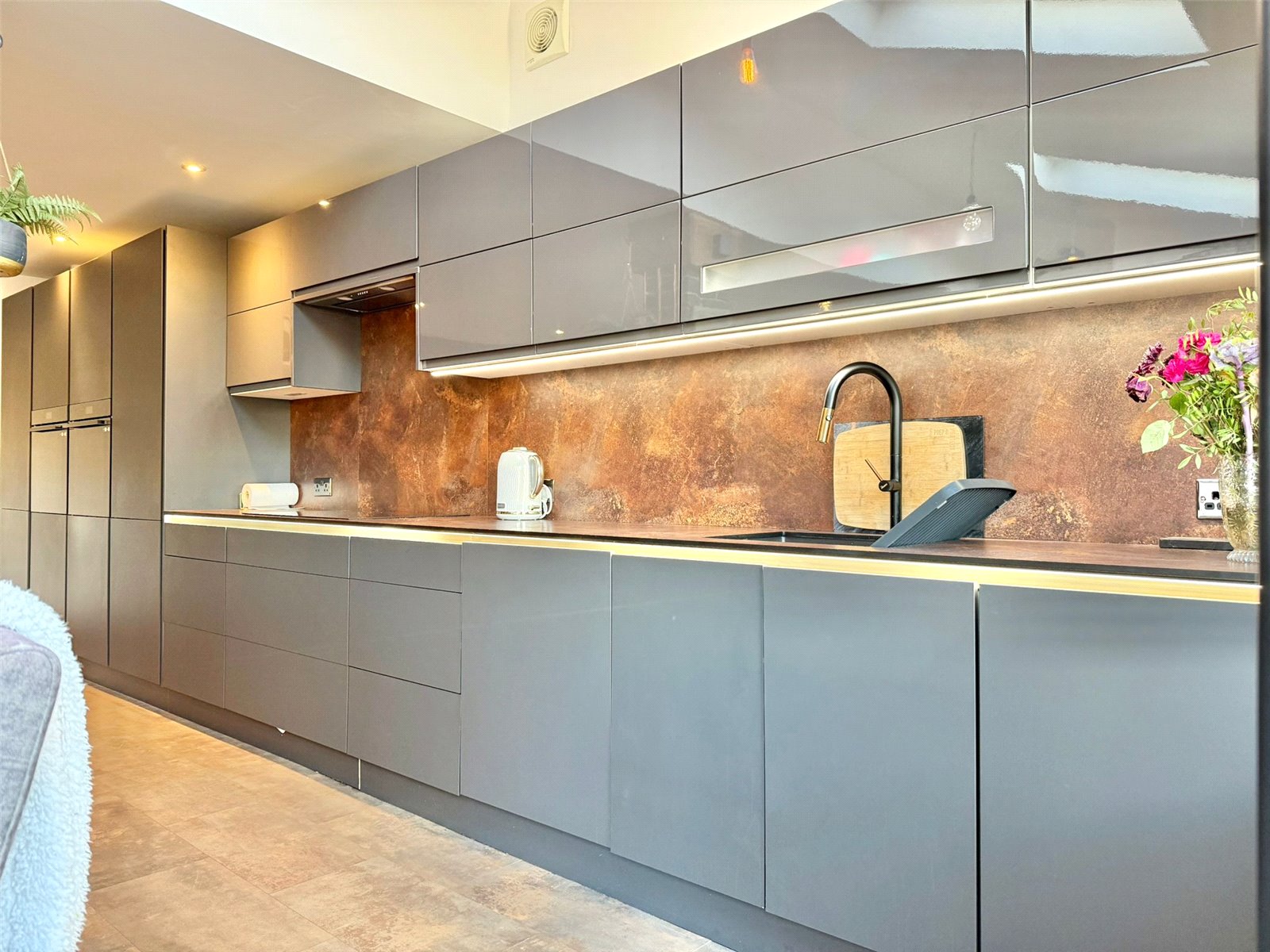LIFESTYLE/LIVING SPACE: 26'1" x 17'5" (7.95m x 5.3m) maximum measurements- A superb modern free flowing living space incorporating a full depth kitchen wall with a mixer tap sink unit set in a slimline worksurface with a comprehensive range of base cupboard and drawer units and matching eye level cupboard units, two integrated Samsung ovens, large induction hob with extractor over, two integrated 70/30 fridge freezers, dishwasher, worksurface lighting. Space for soft furnishing with a central recess Stovex RIVA 66 cassette (8.1kw) wood burner, adjacent integrated illuminated log store and built in media wall, space for a large dining table and chairs, UPVC double glazed double opening doors and adjacent windows overlooking and leading onto the westerly aspect rear garden, two new upright modern radiators, recess ceiling spotlighting