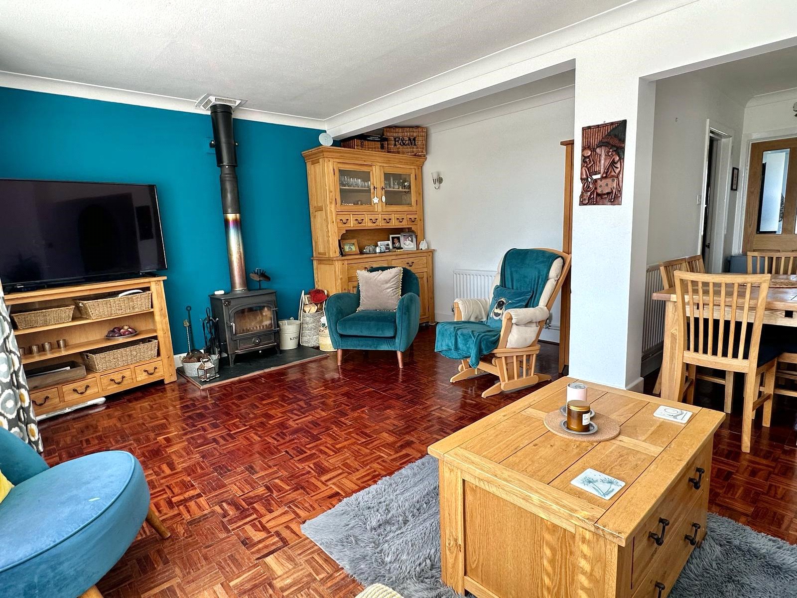A bright living room with a south facing UPVC double glazed front window aspect, central feature wood burner, parquet flooring, wall light points, central heating radiators, understairs cupboard, and door from the Dining Area leading to: